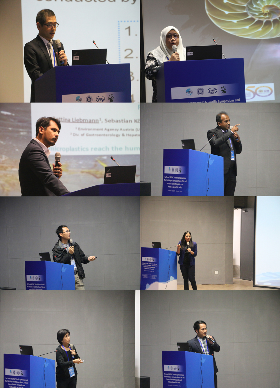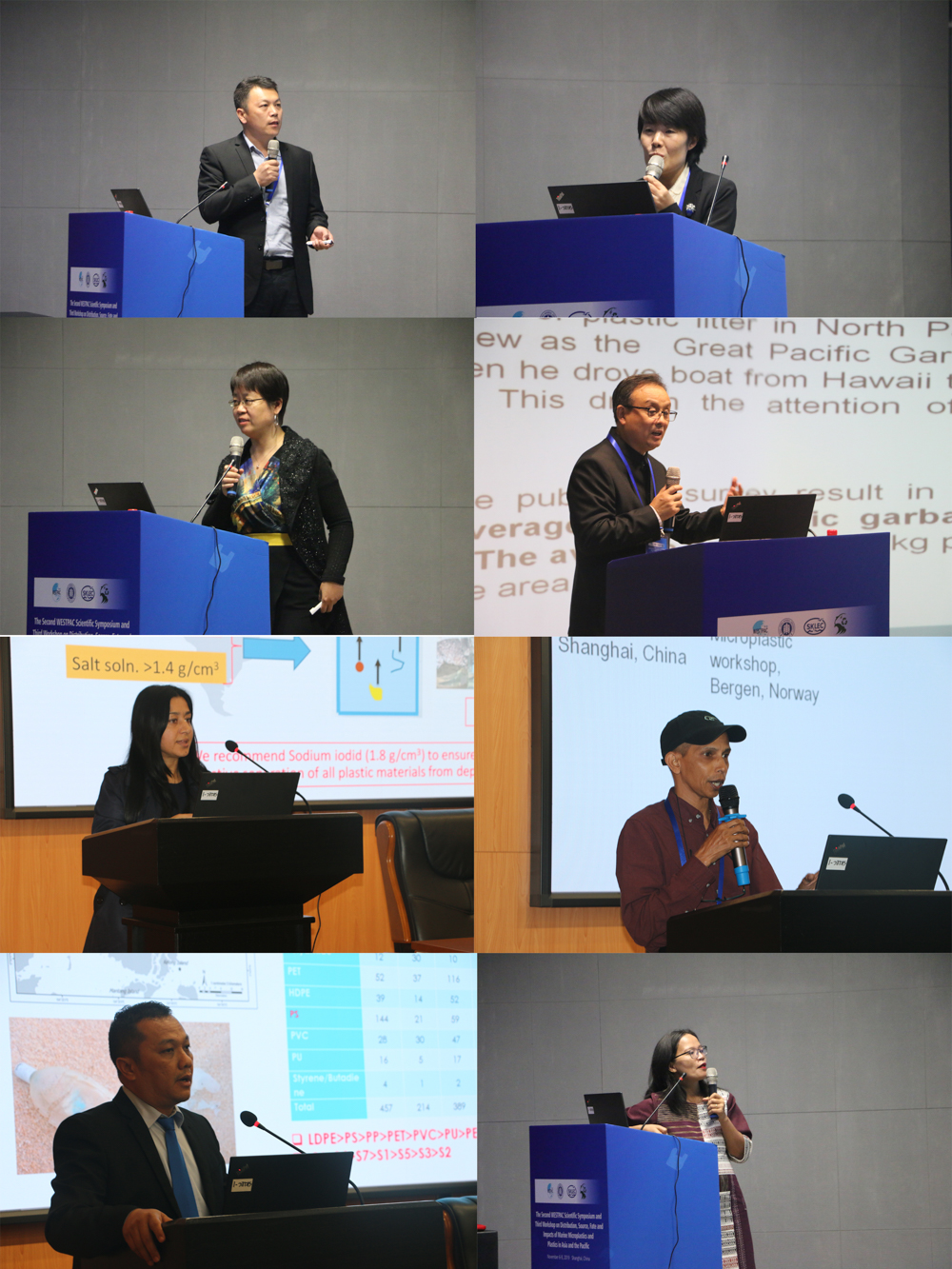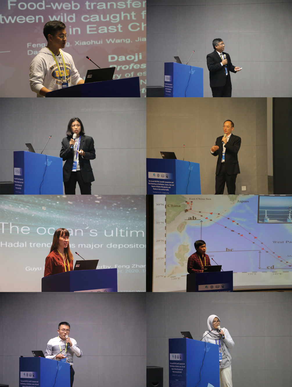 开幕式后,与会的各国专家学者进行了三天的专题系列学术报告和研讨。第一个专题关注海洋微塑料和塑料污染方面最新的监测技术和研究发现,主要包括:研发出了海洋微塑料大体积原位采样技术方法,使深海海洋微塑料定量研究成为可能;通过对海洋生物摄食过程研究,发现了海洋表层漂浮塑料垂向输运机制,揭示海洋微塑料在海洋生物食物网中从底营养级向高营养级传递的新途径;根据实测调查,估算了长江向东海的微塑料输送通量,并建立了中国近海海洋塑料的输运模式;通过大洋的走航调查,首次研究发现了陆源微塑料通过大气向近岸海域及大洋的输送,并给出了亚太区域大气微塑料向西太平洋和东印度洋的输送通量;研究确定了太平洋超深渊海底哈达尔海沟是塑料污染的主要储存地;通过对海洋微塑料的光化学降解过程研究,首次定量给出了主要海洋塑料种类降解产物溶解有机碳的产生速率及海洋微生物对其的利用效率。此外,第一专题会议还对联合国环境署海洋垃圾热点评估方法进行了介绍。
