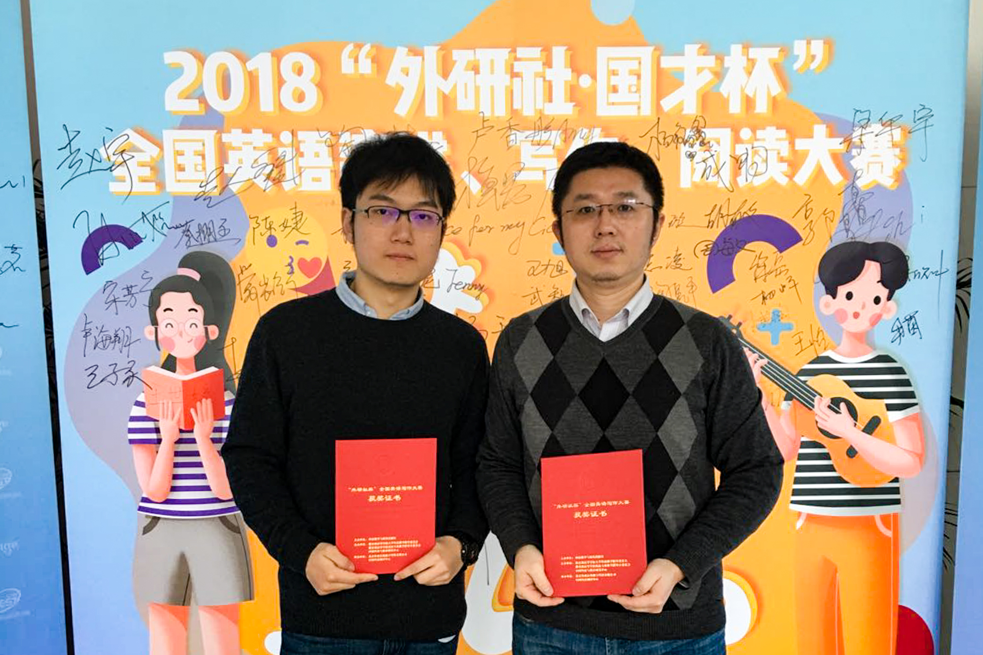 王越老师(右)指导的学生赵隽元(左)获2018“外研社·国才杯”全国写作大赛一等奖和上海赛区特等奖