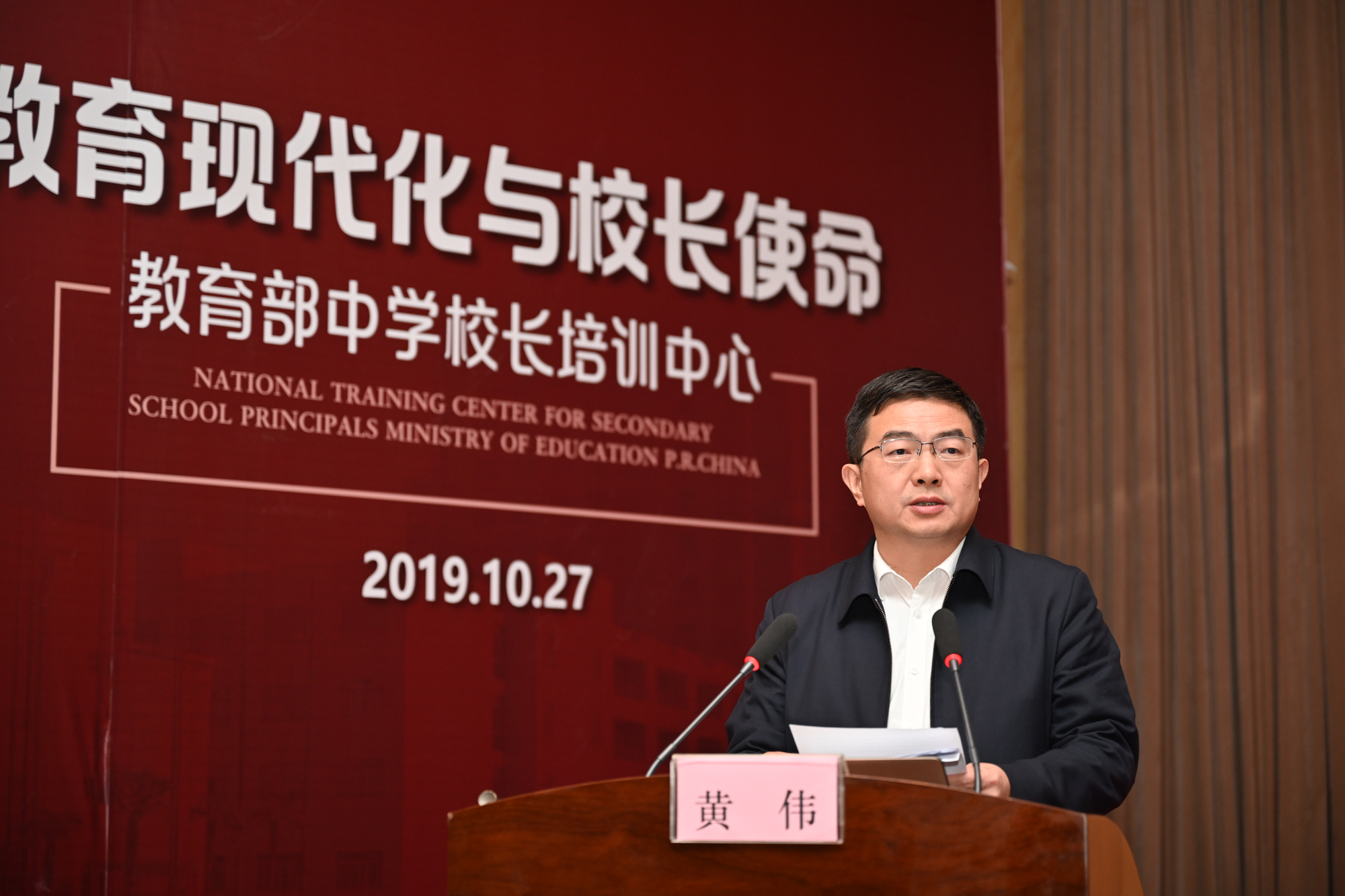 教育部教师工作司副司长黄伟代表教育部教师工作司对教育现代化与校长使命研讨会暨教育部中学校长培训中心30周年庆典活动的举办表示热烈的祝贺。他指出,教育部中学校长培训中心在我国基础教育改革与发展中做出了积极地贡献,一直引领着全国教育干部培训事业的发展。他高度肯定了中学校长培训中心30年来在校长培训模式创新、高端校长培训、海外交流以及服务中西部教育发展等方面取得的卓著成就。并希望以中学校长培训中心为代表的全国中小学校长培训机构在新的时代能够不断加强自身思想建设和学术建设,主动适应校长培训的新趋势,在体系建设、质量保障、模式创新、管理体制上取得新突破,为国家造就一支政治过硬、品德高尚、业务精湛、治校有方的校长队伍。