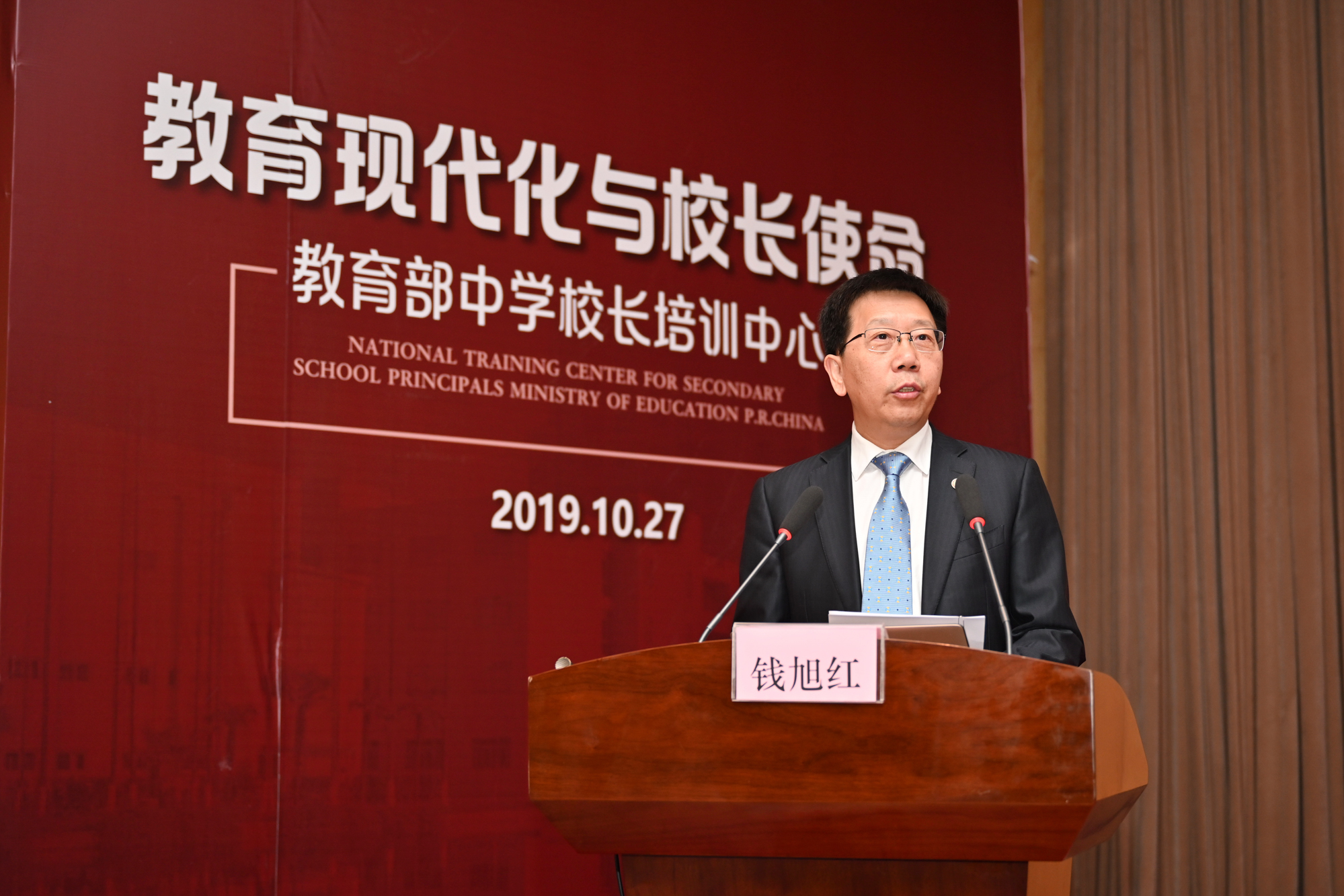 钱旭红在致辞中对教育现代化与校长使命研讨会暨教育部中学校长培训中心成立30周年表示热烈的祝贺,并指出,30年来,教育部中学校长培训中心以服务国家教育发展战略、服务教育基层学校改革与发展,服务我国教育干训事业发展为目标,在教育部的关心、指导下,在中学校长和社会各界的支持下,培训中心励精图治,开拓进取,培训规模不断扩大,培训质量稳步提高,学员遍及海内外,造就了一大批政治过硬、理想高远、业务精深、办学成就卓著的中学校长,发展了以中学校长高端培养培训为特色和优势的办学格局,培训质量受到广泛好评,被中学校长亲切地誉为“教育家的摇篮”,为促进中学校长的专业发展、提高教育干训事业的水平,推动我国基础教育的改革作出了积极的贡献。学校历届党政领导高度重视培训中心的发展,积极指导、支持和帮助培训中心的发展。他期待,在新的时代,希望教育部中学校长培训中心以30周年庆典为契机,认真贯彻执行新时代党的教育路线方针政策,在上级的领导和社会各界支持下,继续努力,牢记使命,砥砺前行,在新时代中国教育走向现代化的征程中,为造就党和人民满意的高素质专业化创新型校长队伍,为推动我国基础教育的改革和发展,探索中国特色社会主义教育发展道路,培养德智体美劳全面发展的社会主义建设者和接班人,作出新的、更大的贡献。