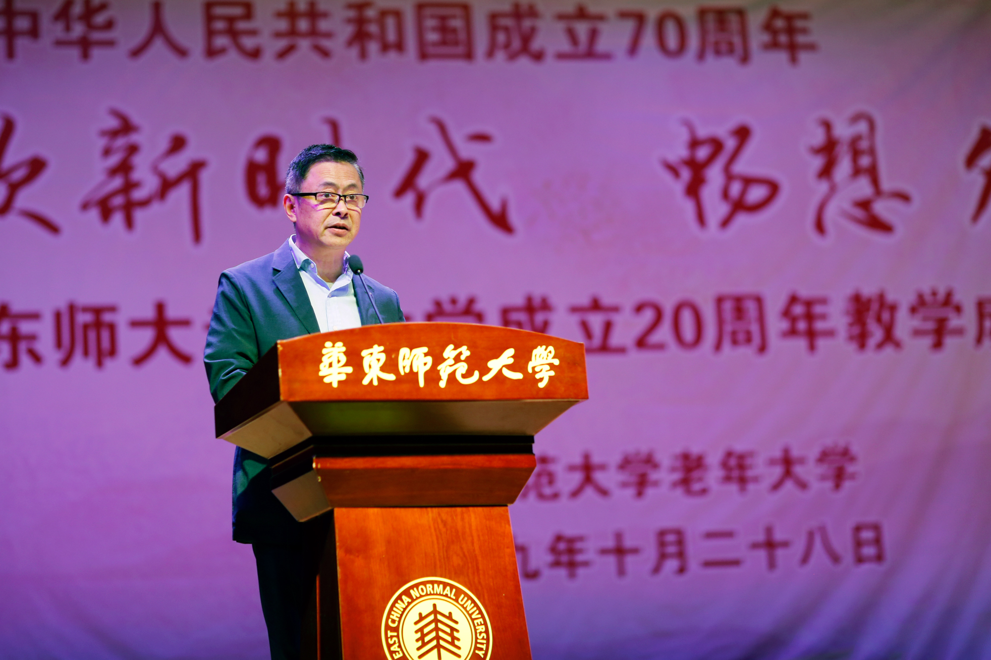金秋十月,在硕果飘香的季节里,在喜迎祖国七十华诞的喜悦中,华东师大老年大学迎来了二十岁生日。10月28日下午,中山北路校区思群堂内欢歌笑语,喜气洋洋,老年大学全体师生相聚在秋日的丽娃河畔,共同庆祝华东师大老年大学成立20周年暨第七届教学成果展演。副校长梅兵,老龄办主任兼离退休党工委书记黄平,老年大学历任校长杜公卓、鲍修德、崔极谦老师,为老年教育工作作出突出贡献的各院系(单位)代表以及老年大学全体师生共800余人出席活动。华东师大老年大学常务副校长裴建华主持庆祝仪式。