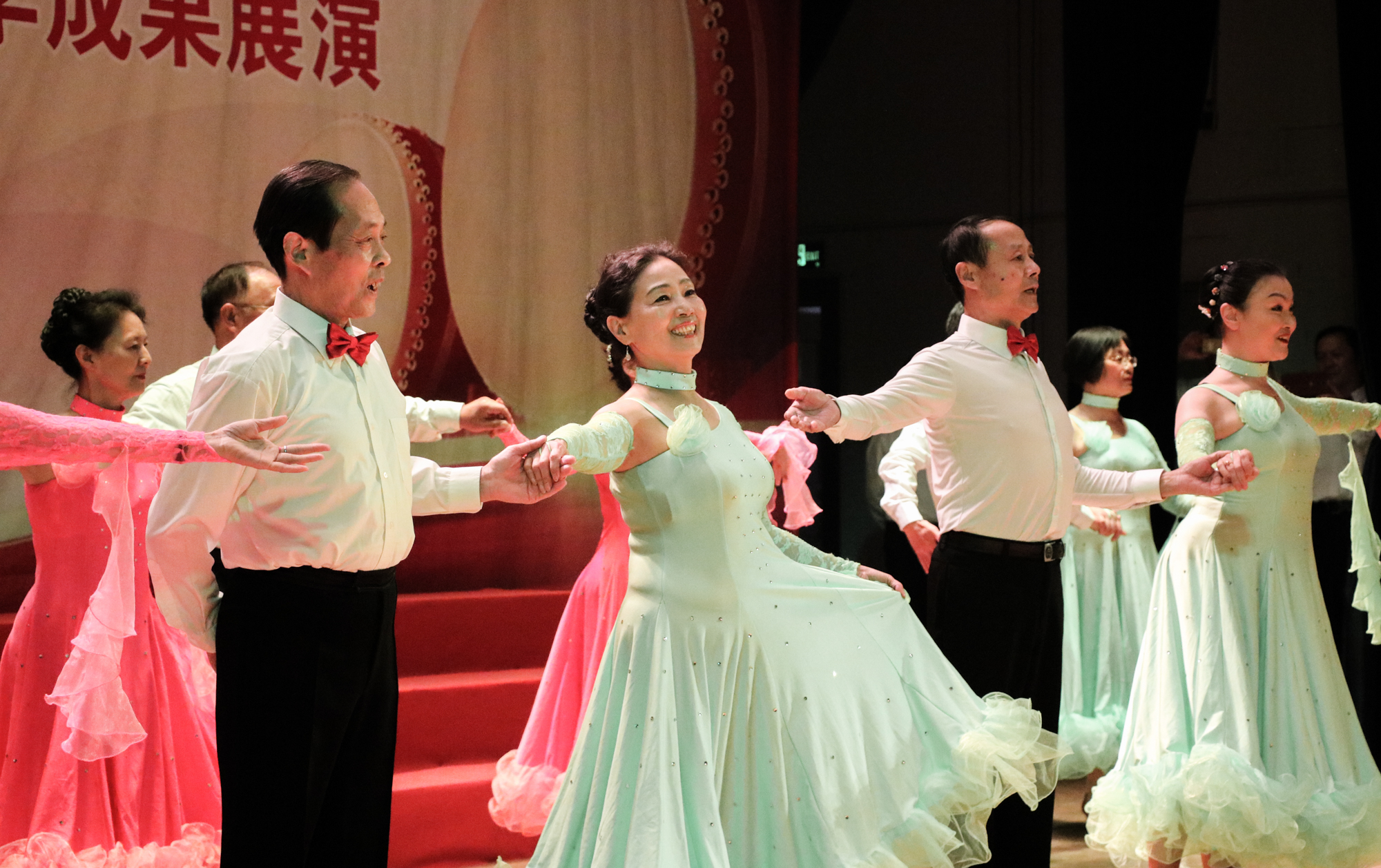 表彰仪式结束后,老年大学第七届教学成果展演开始。在汇报演出中,来自各个专业班级的近500名学员表演了合唱、舞蹈、二胡合奏、诗朗诵、时装表演、太极扇、英语联唱、越剧等22个节目。丰富多彩的节目不仅彰显了中华民族传统文化的魅力,也展现出世界文化的丰富性与多样性。参演学员虽均已年过半百,更有些鹤发童颜、年过耄耋,但他们精彩纷呈、活力十足的表演赢得了台下观众阵阵掌声。学员们用精彩纷呈的节目表现出老年大学的教学成果,用嘹亮的歌声歌颂建国70周年,用优美的舞姿讴歌新时代、畅想夕阳红。
