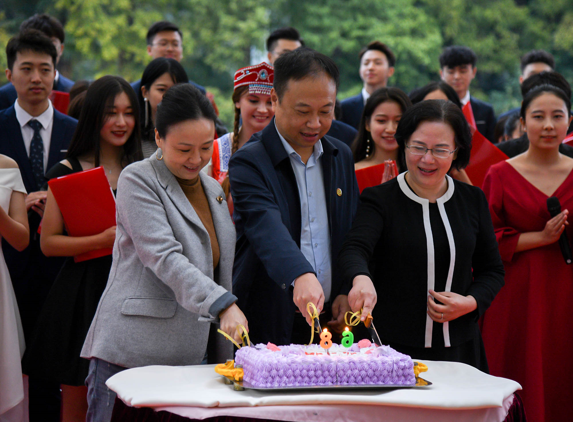本次咖啡文化节还设有“为师大庆生”环节,师生们一起切蛋糕,为华东师大建校68周年送上送福,并合影留念。
