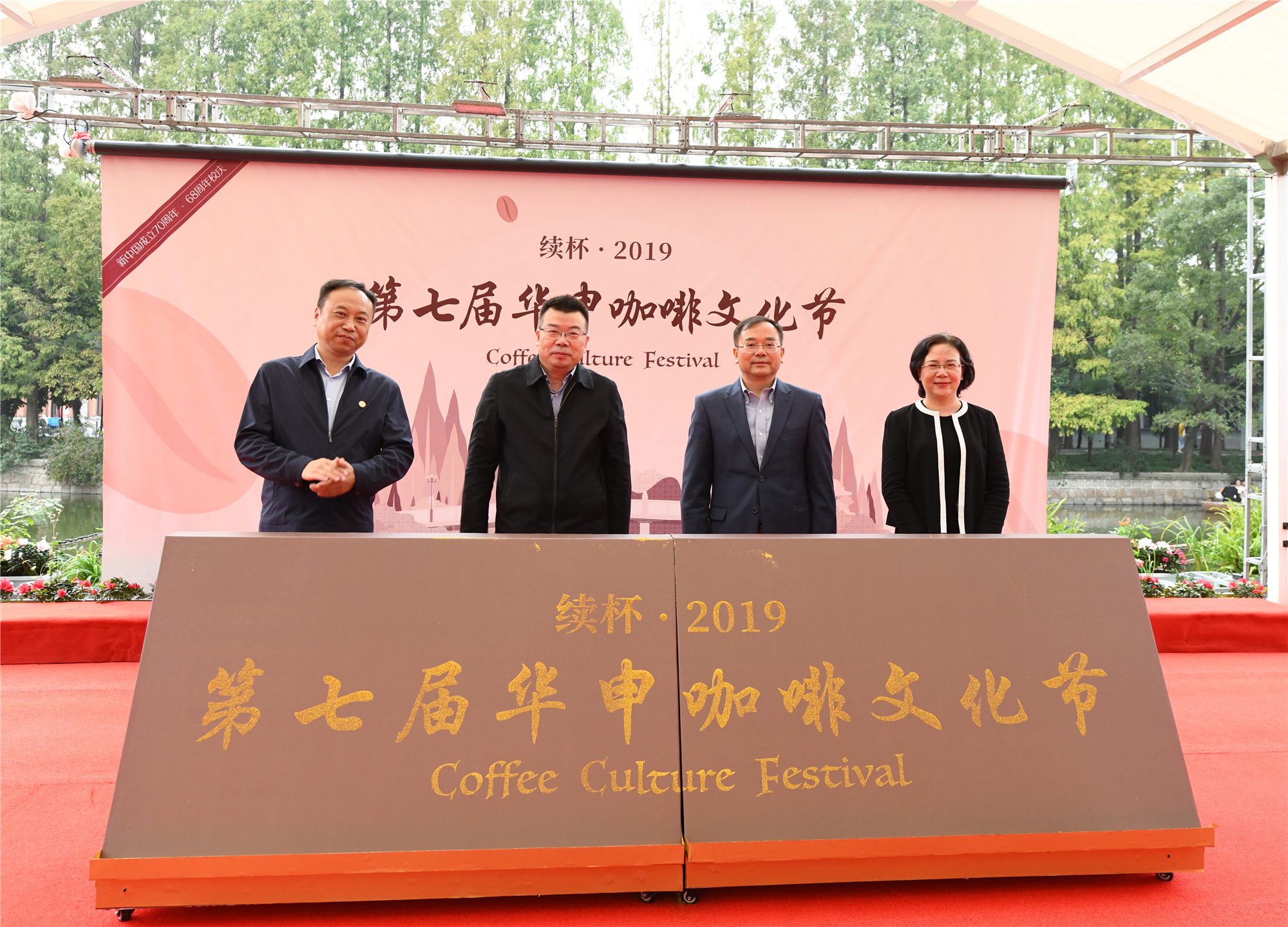 启幕仪式上,孙真荣、周傲英、戴立益、王焰共同用金色的鎏沙描画出“第七届华申咖啡文化节”字样,金光熠熠的大字与水波涟涟的丽娃河遥相呼应,预示着多元文化的交相辉映、不同思想的交流争鸣。