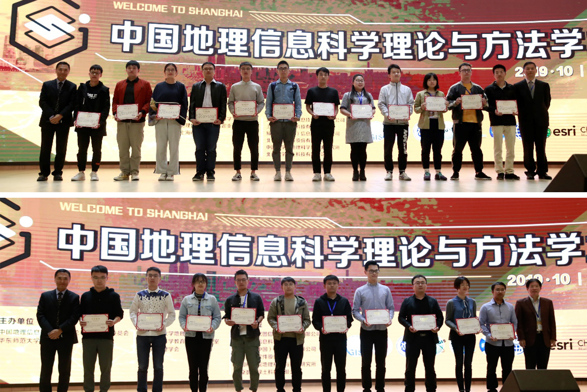 为鼓励广大青年教师与研究生,大会举办了青年教师论文竞赛和研究生论文竞赛。经过与会专家的认真评审,来自香港大学的张鸿生和北京师范大学的赵文智获得了青年教师组的一等奖。来自北京师范大学的李露凝和深圳大学的林浩嘉获得了研究生组的一等奖。本次大会还设立了海报交流比赛,6个场次共计99张海报参展。经过激烈的角逐,最终来自西南交通大学的郎垚和武汉大学的冯明翔获得了海报竞赛一等奖。颁奖环节由华东师大地理科学学院副院长李响教授主持,中国地理信息产业协会理论与方法委员会主任委员陆峰教授和吴华意教授向获奖者颁发了证书。