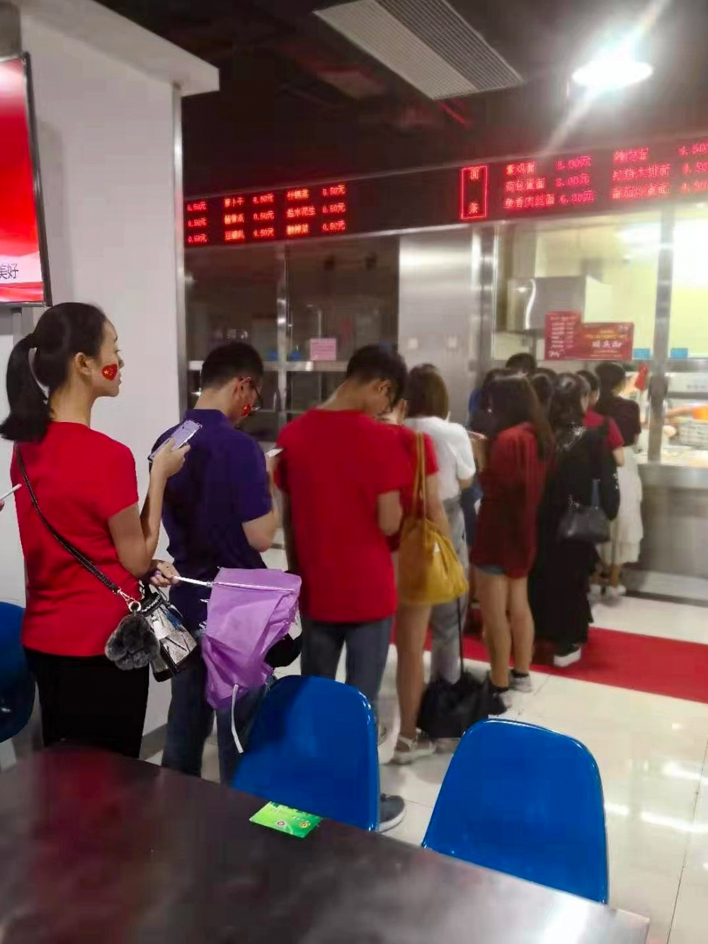 国庆面食材新鲜,选择丰富,好吃不贵,受到了师生们的热切追捧,两校区的食堂专窗前都排起了长队。许多学生吃面时还在脸上专门贴了红旗等贴纸。