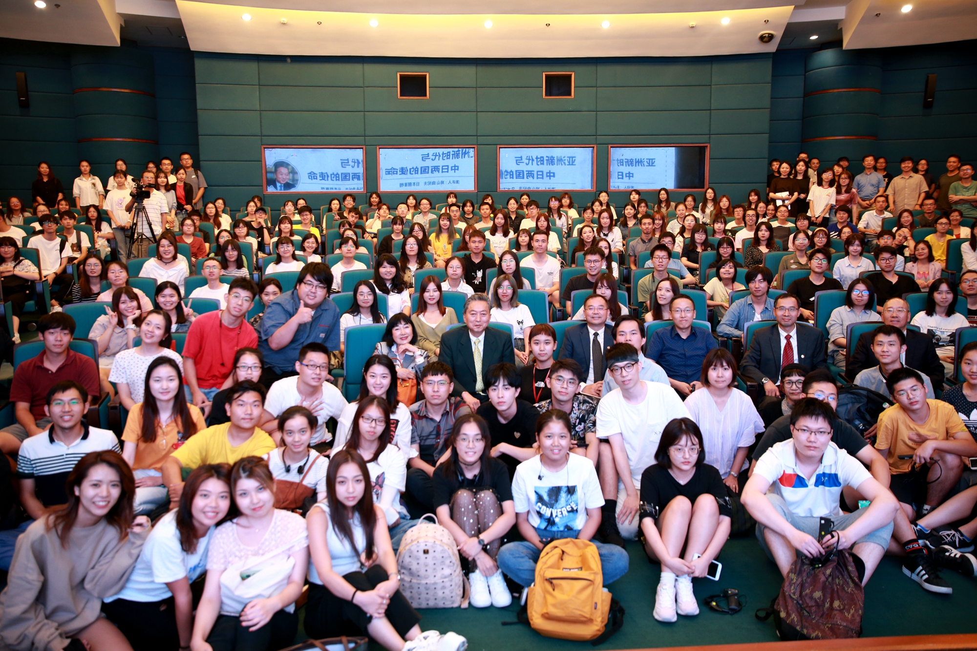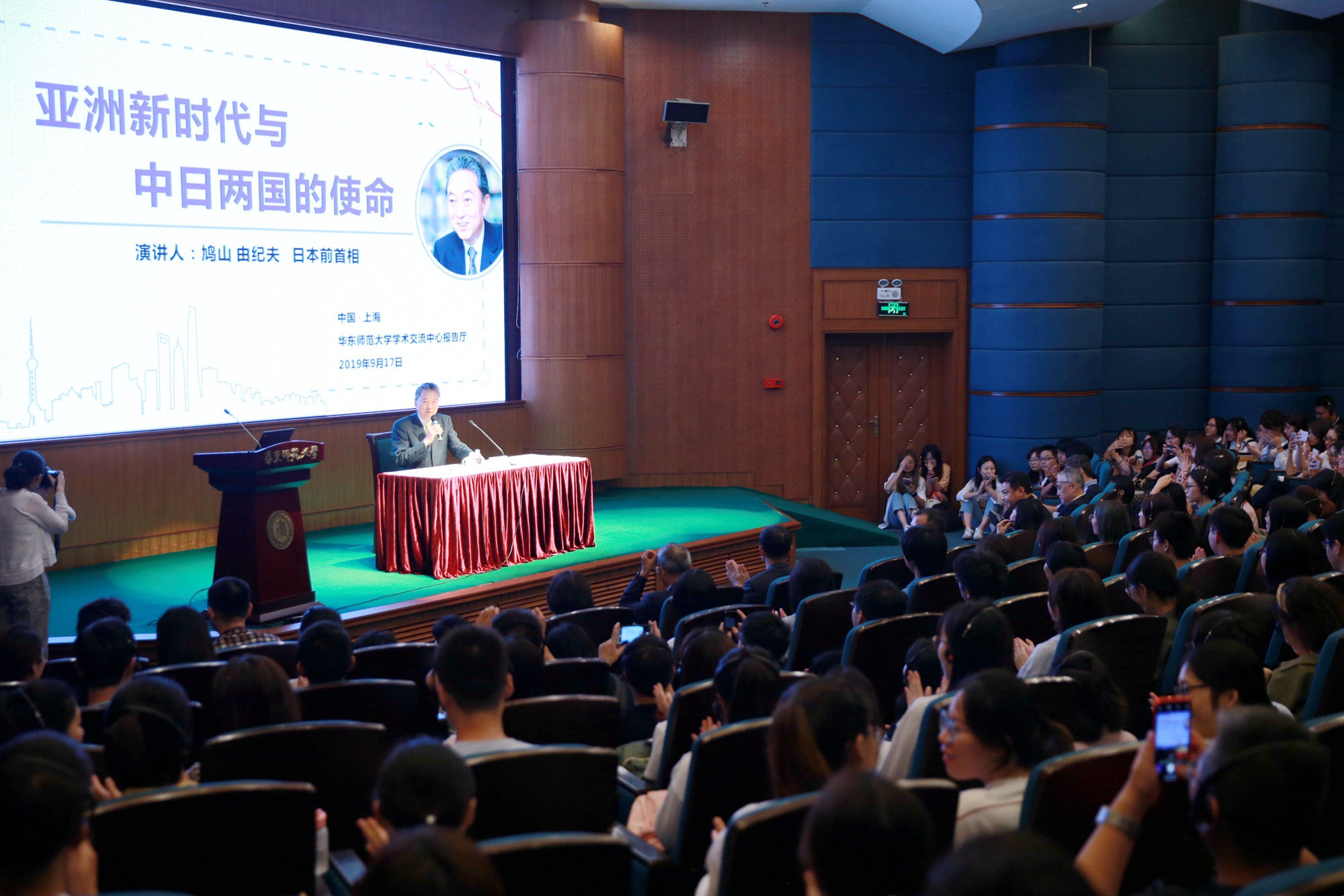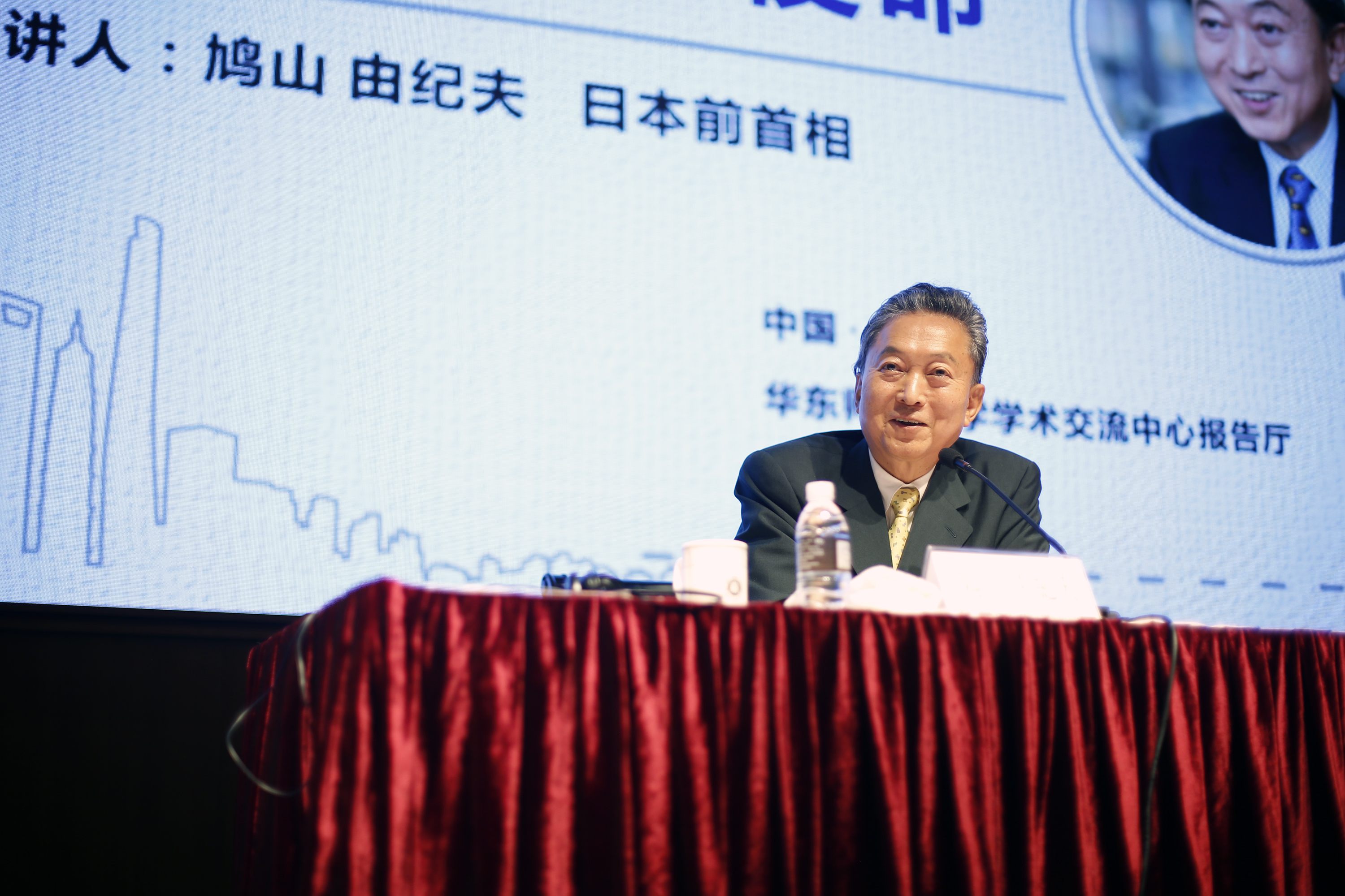 “大家的热情是充满诚意的,我感到十分幸福!我的夫人鸠山幸在上海出生。上海对我们来说,是有特别情感的地方,在这里演讲,我真的感到非常幸福。”15时半,鸠山由纪夫准时出现在报告厅,一开场与满座的师生用日语互问“你好!”。