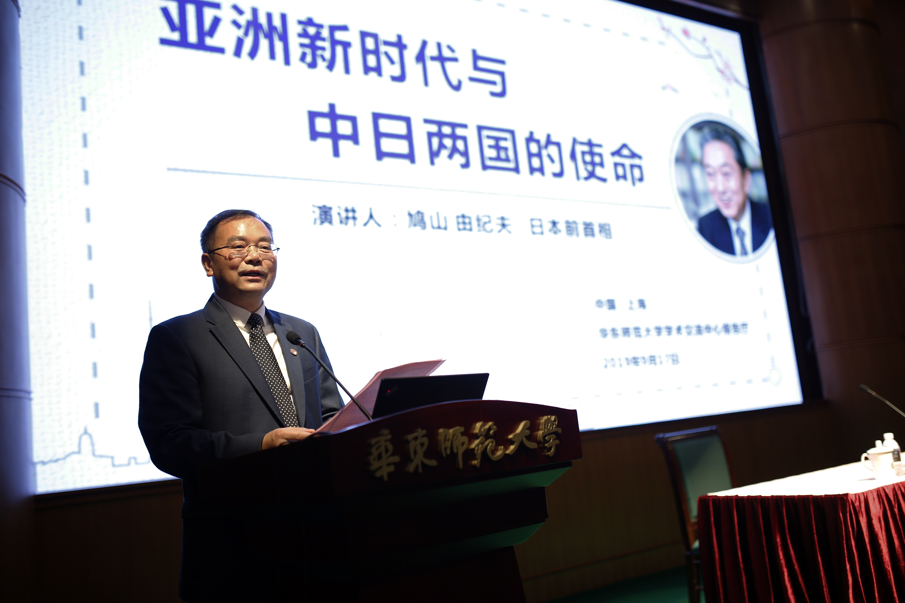 演讲会由华东师大副校长周傲英主持,演讲会前,鸠山由纪夫先生一行参观了校史馆。