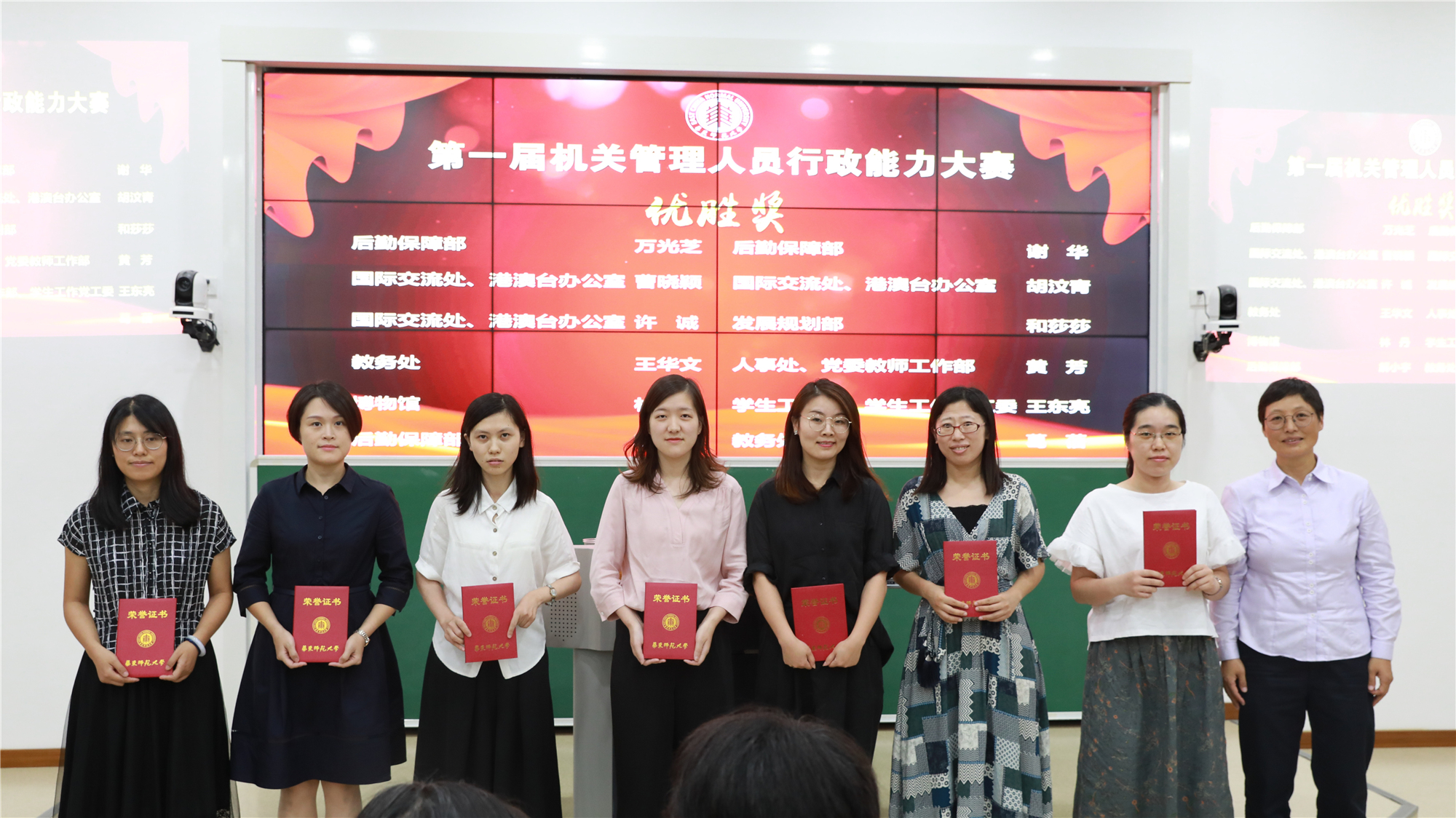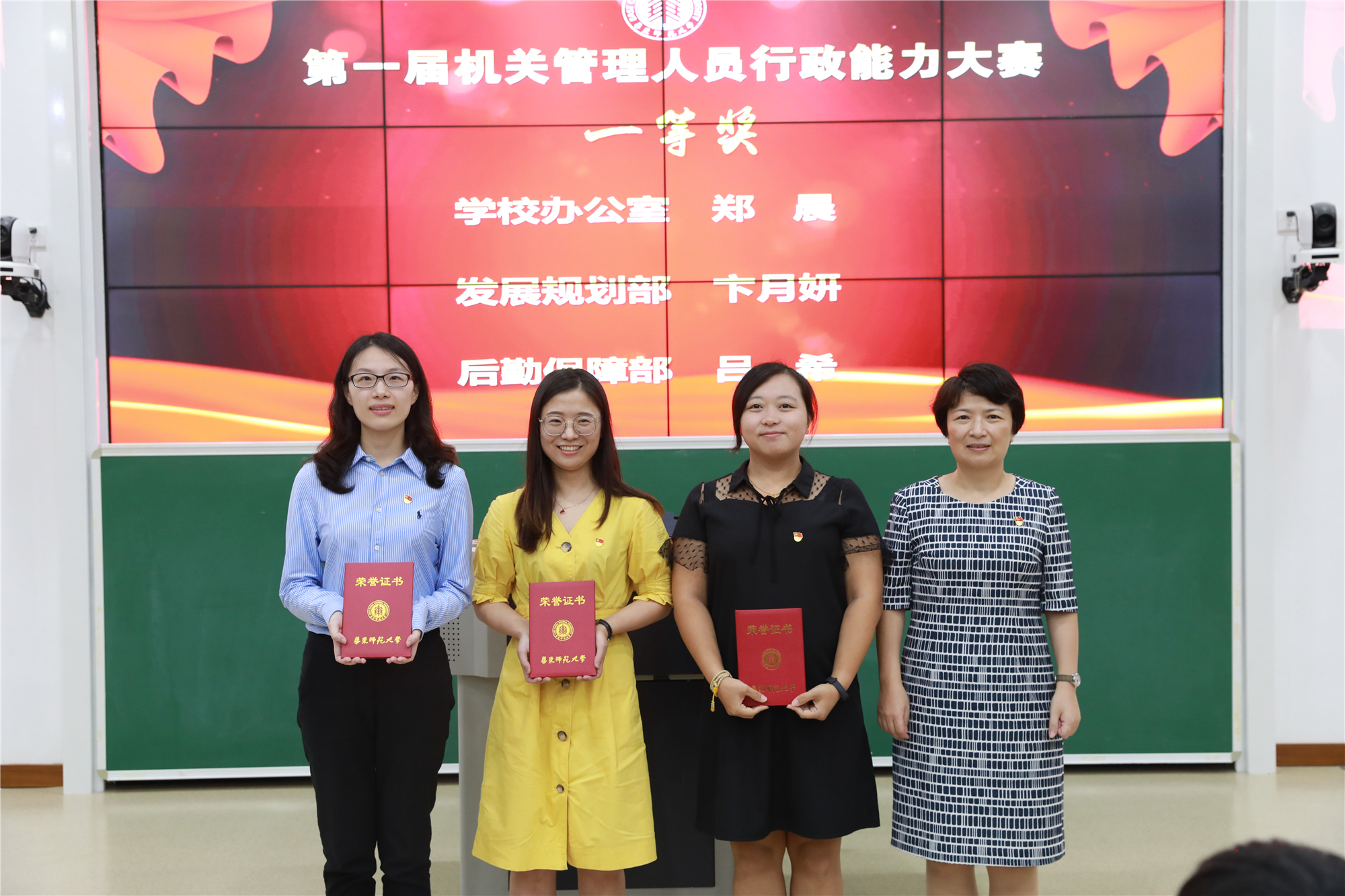 颁奖典礼上,程静宣读了《关于表彰3245澳门新莆京机关管理人员行政能力大赛获奖人员的决定》。本届大赛共有郑晨等31位选手获奖,其中一等奖3名、二等奖6名、三等奖10名、优胜奖12名。与会嘉宾梅兵、施国跃、王平、王淑仙分别为获奖老师颁发荣誉证书。