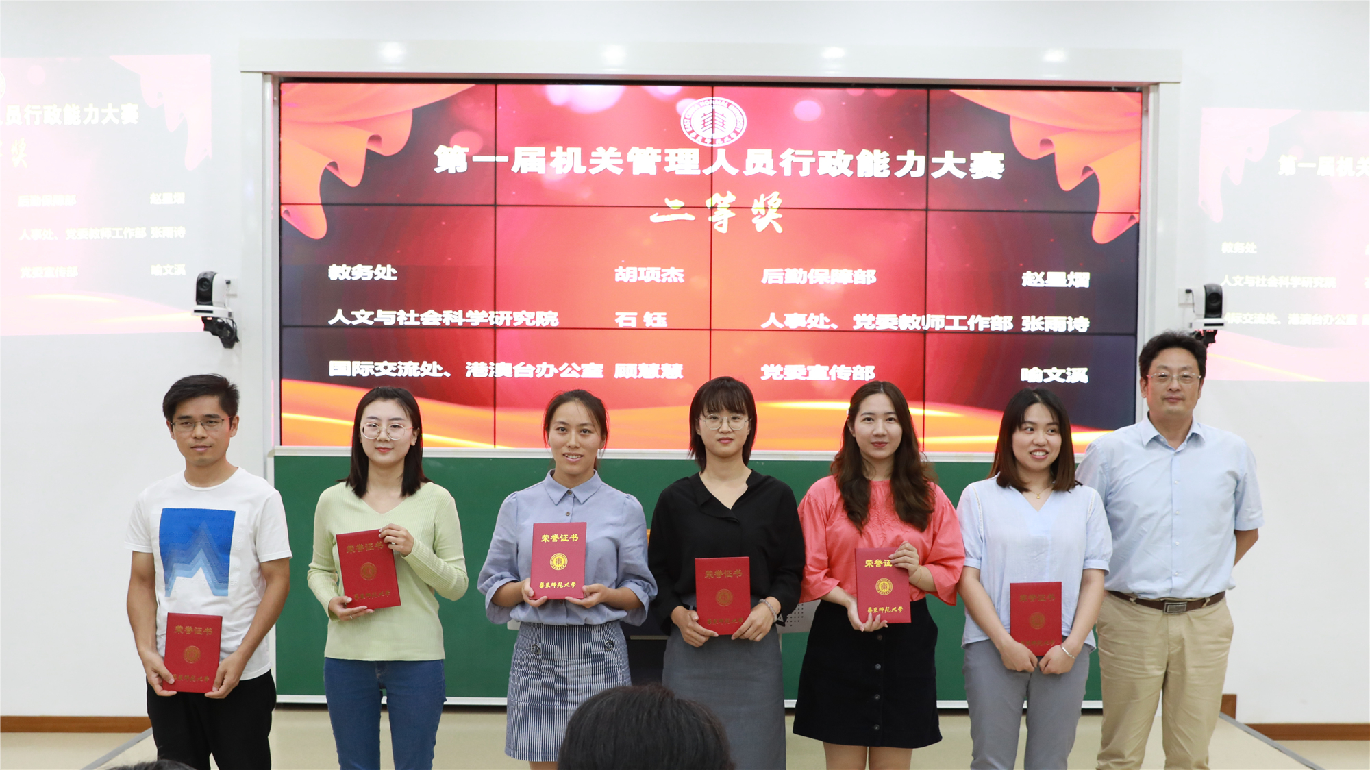 9月17日下午,我校第一届机关管理人员行政能力大赛颁奖典礼在闵行校区第一教学楼214室举行。校党委常委、副校长梅兵,校党委常委、党委组织部部长程静,机关党工委书记王淑仙,人事处处长、党委教师工作部长施国跃,校工会常务副主席王平,机关党工委副书记张军,开放教育学院副院长吴德芳,31位获奖人员,第30期全体新进行政管理人员共同出席典礼。颁奖典礼由张军主持。