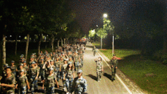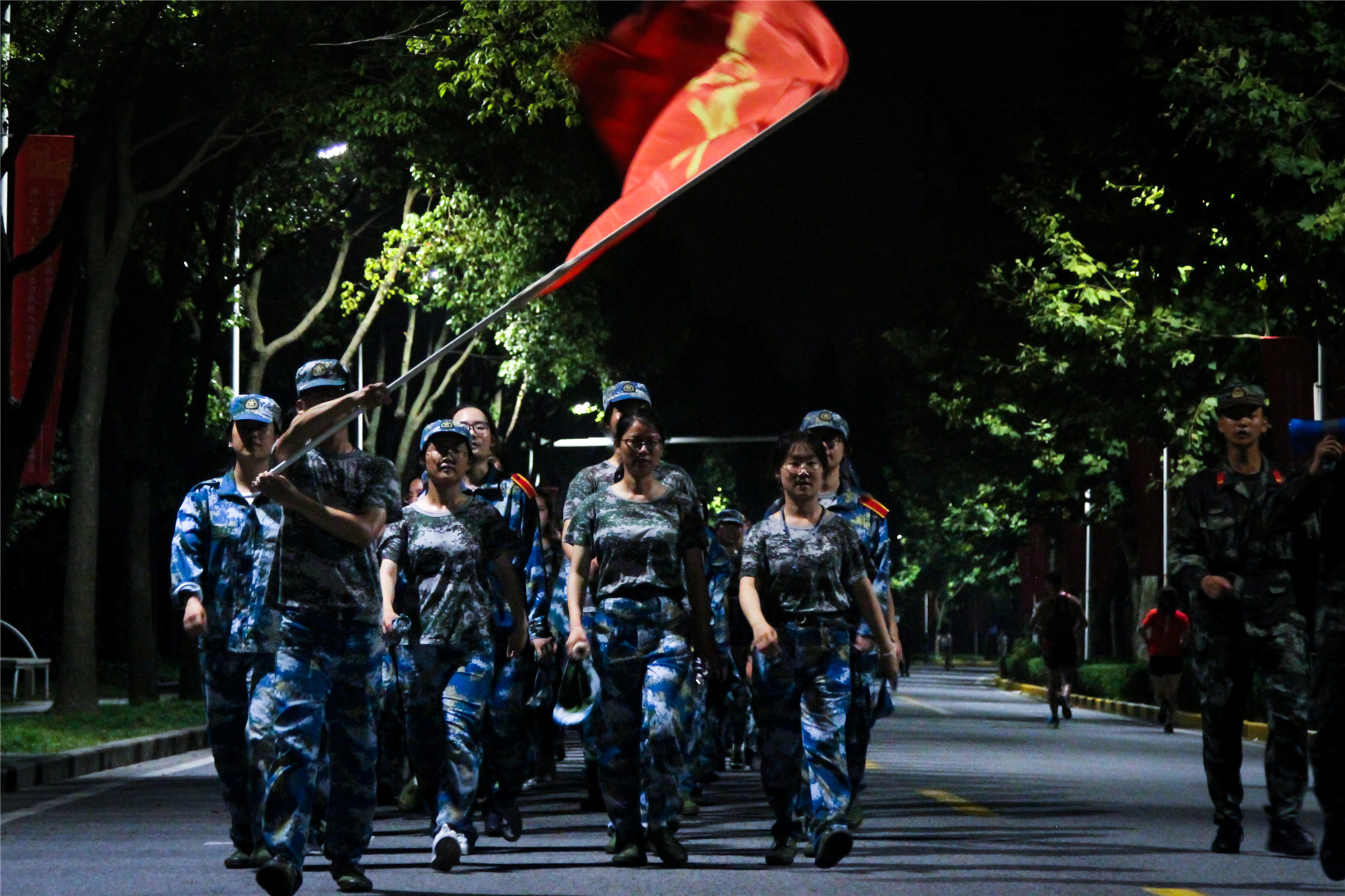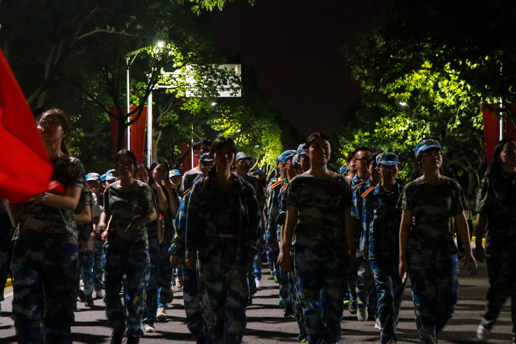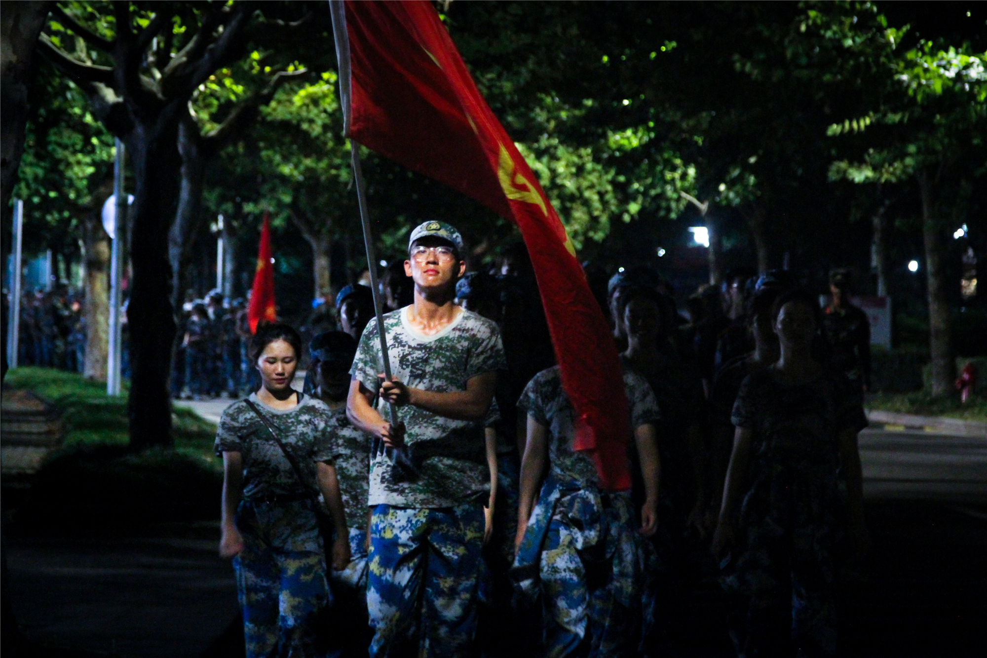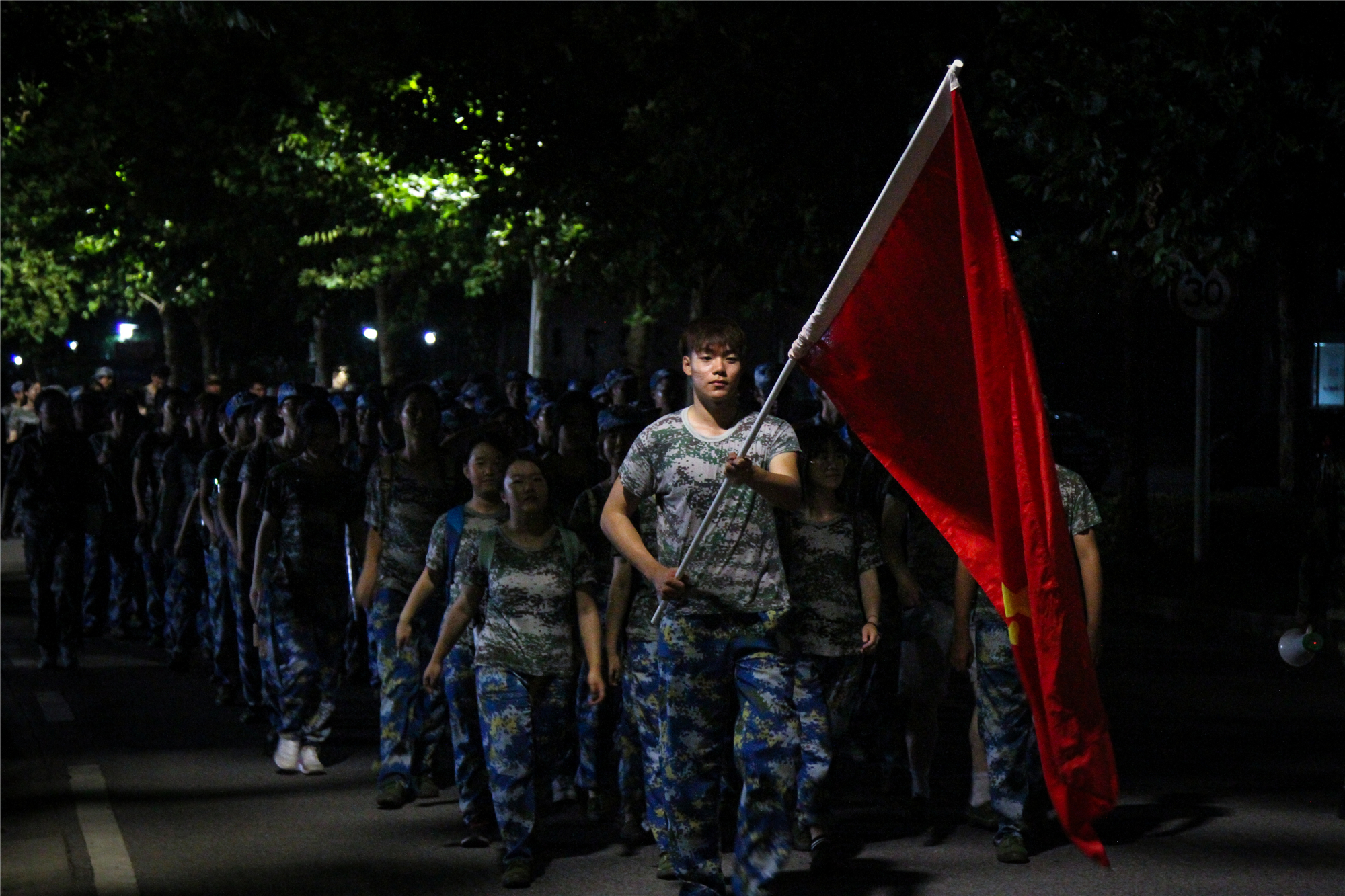 “秣马扬帆,团结向前!”“不畏艰险,勇往直前!”“百炼成钢,共创辉煌!”伴奏各连震耳欲聋的口号,绵延1公里的队伍整齐行进,跨过文脉廊,穿过大学林,迎着夏夜微凉的樱桃河风,同学们跟着旗帜,一路向前。