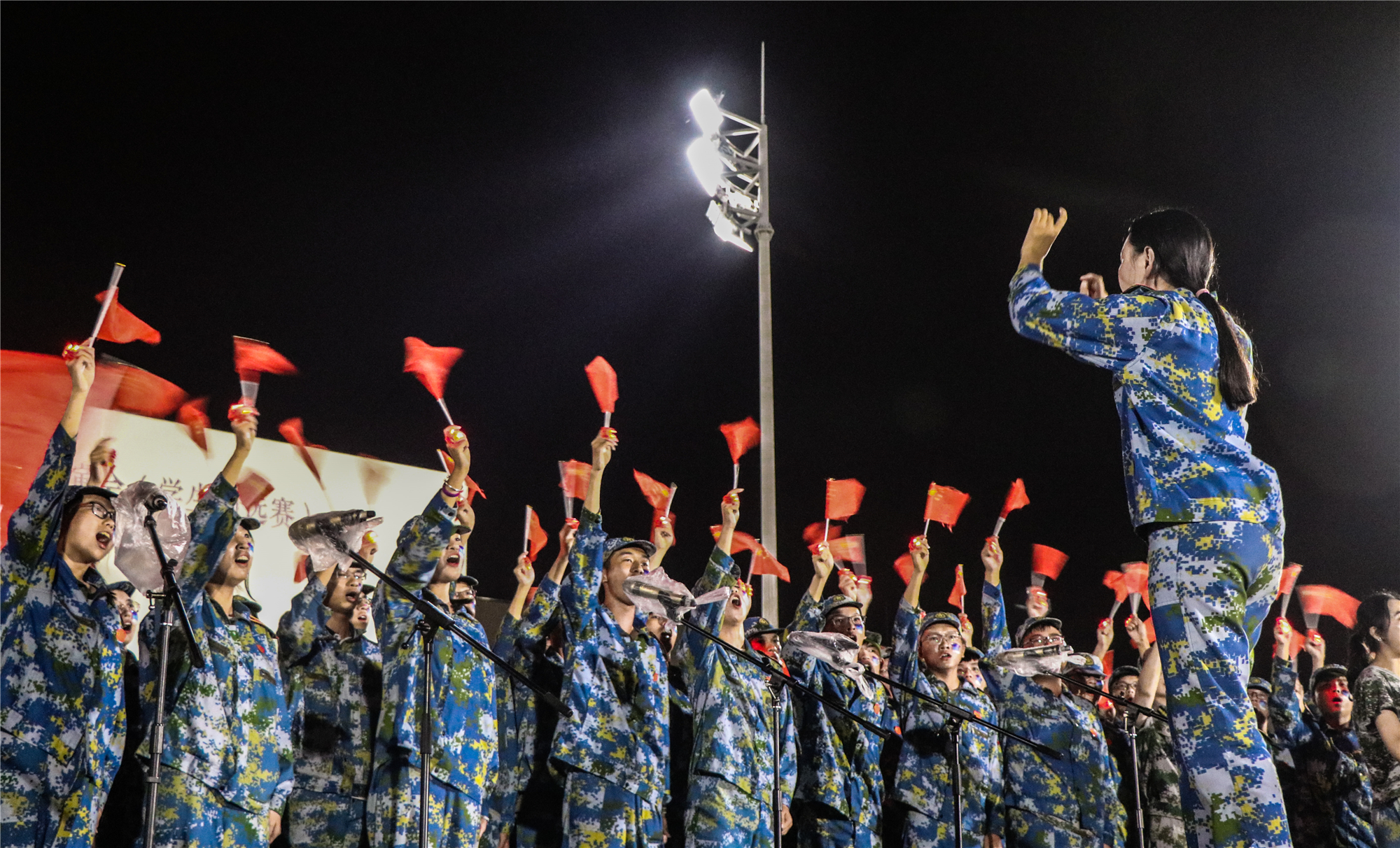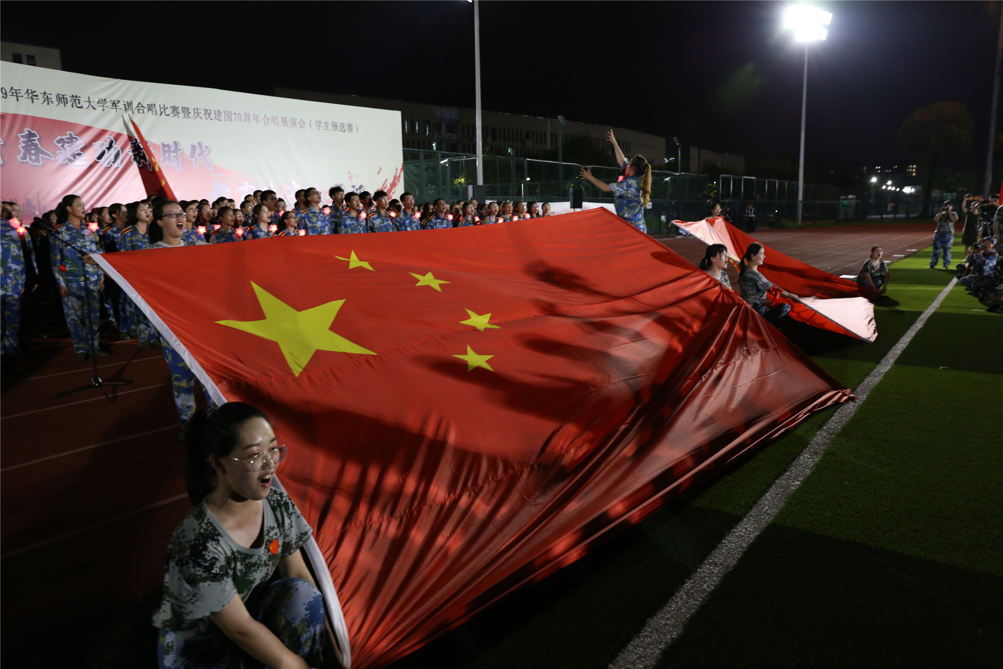 “五星红旗迎风飘扬,胜利歌声多么响亮;歌唱我们亲爱的祖国,从今走向繁荣富强……”8月28日晚,2019年华东师大军训合唱闵行校区比赛现场,全体2600名参训学生手舞国旗齐唱《歌唱祖国》,嘹亮的歌声冲破云霄。