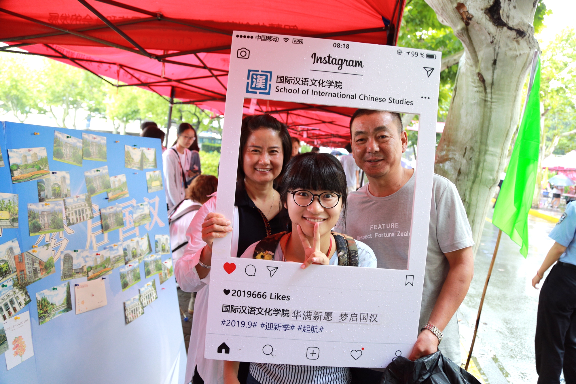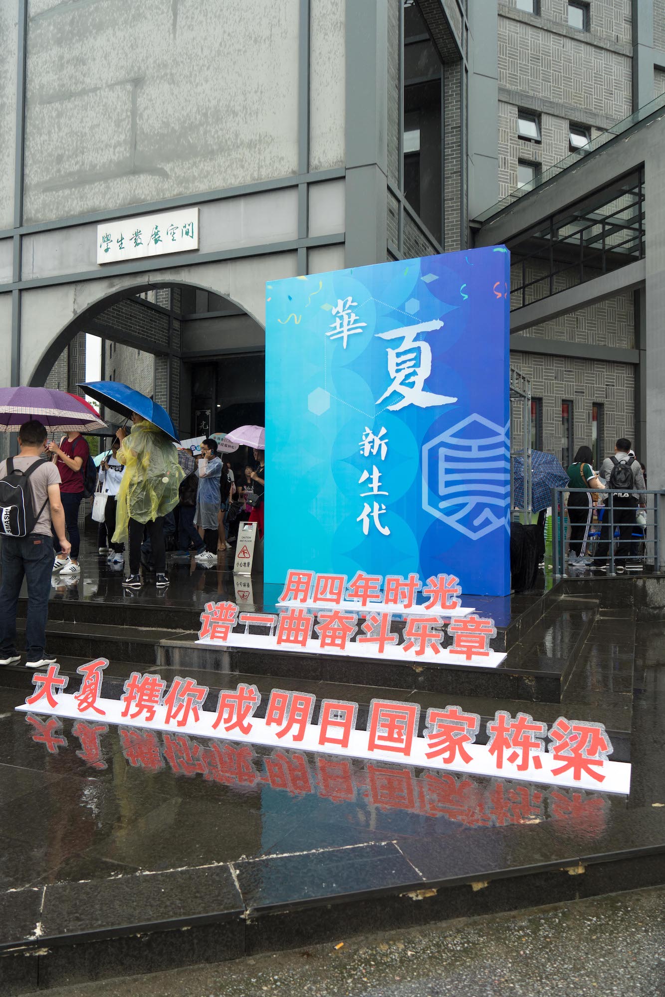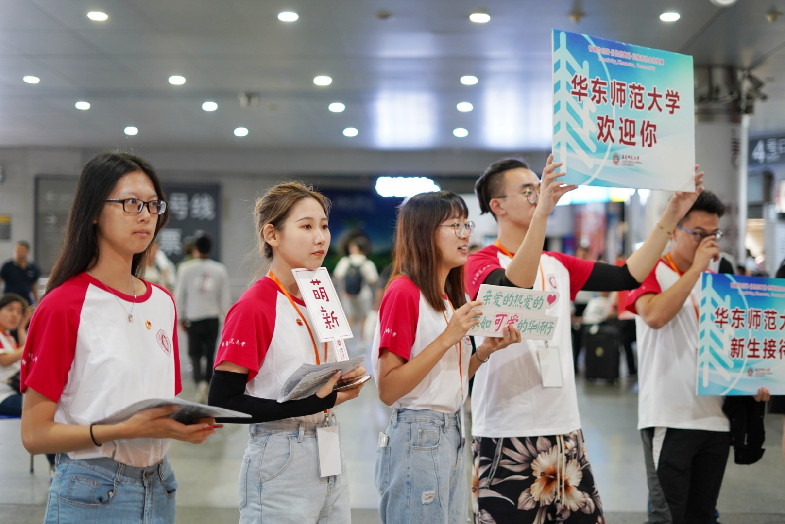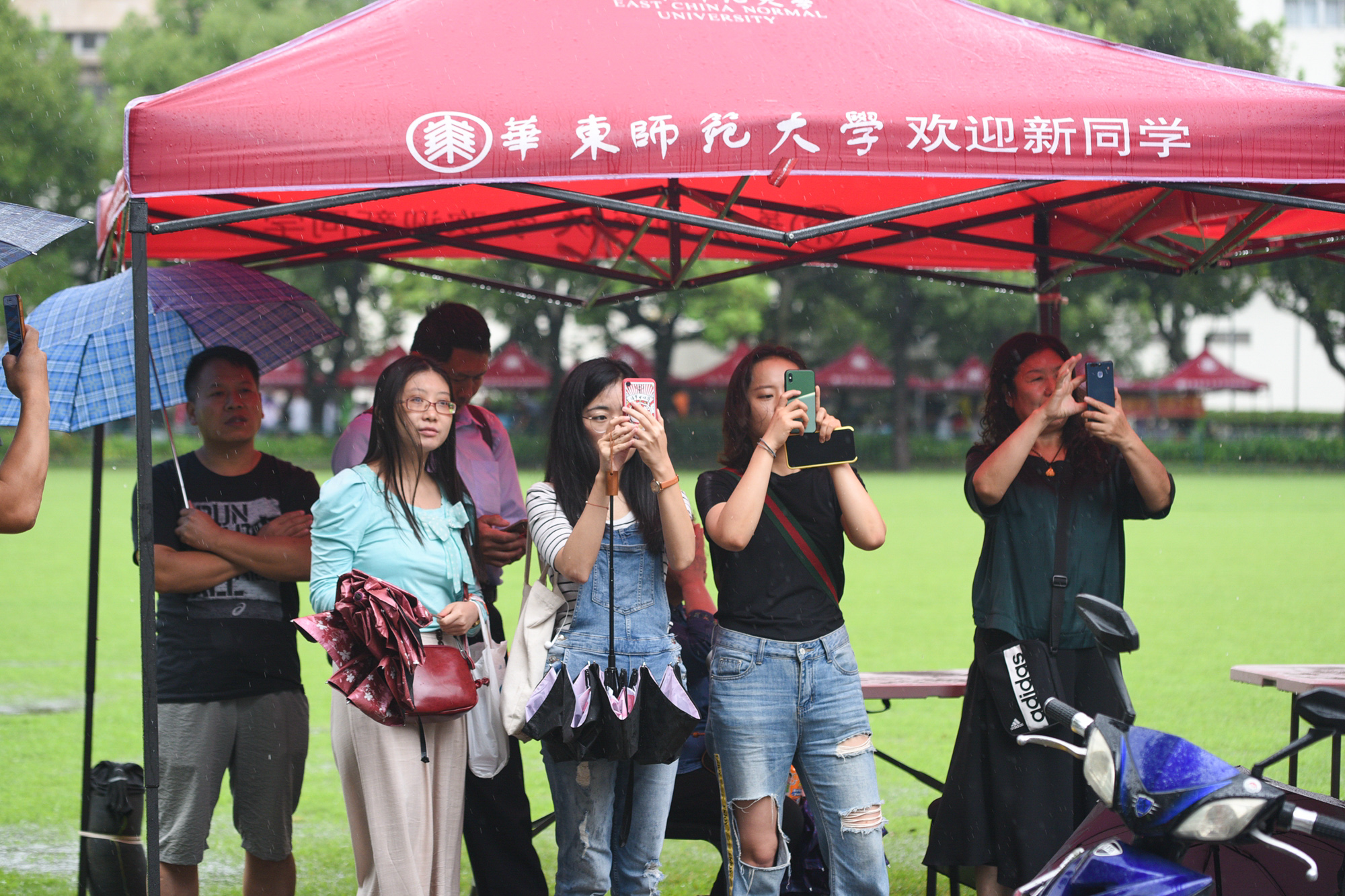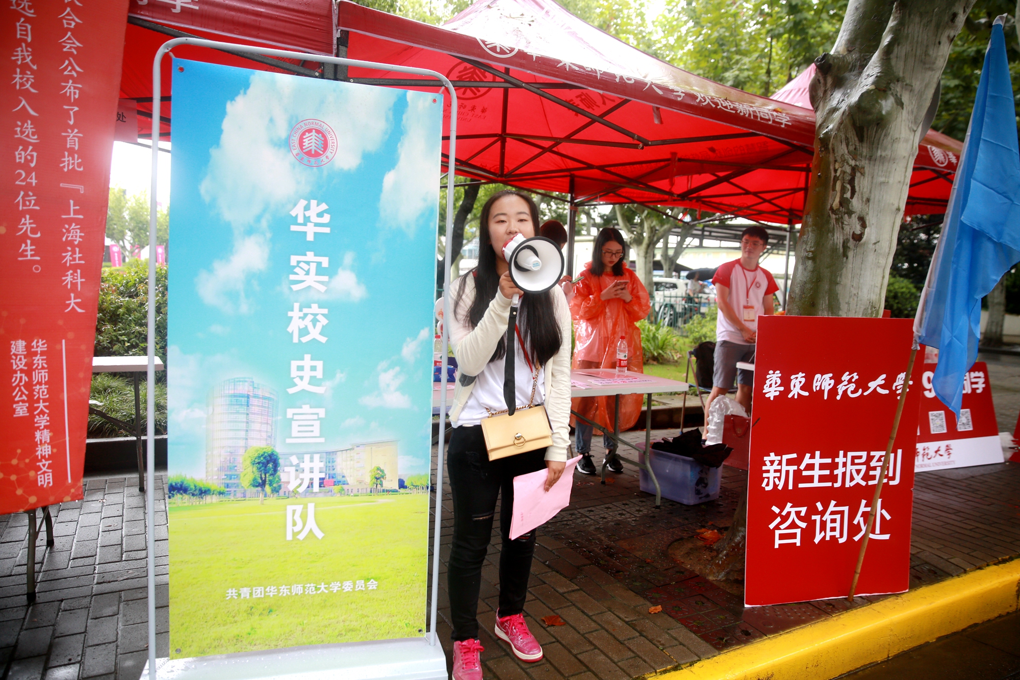 一大早,尽管天气预报有大雨,200多名志愿者准时奔赴校外五大站点以及两大校内站点,接待和引导新生报到。