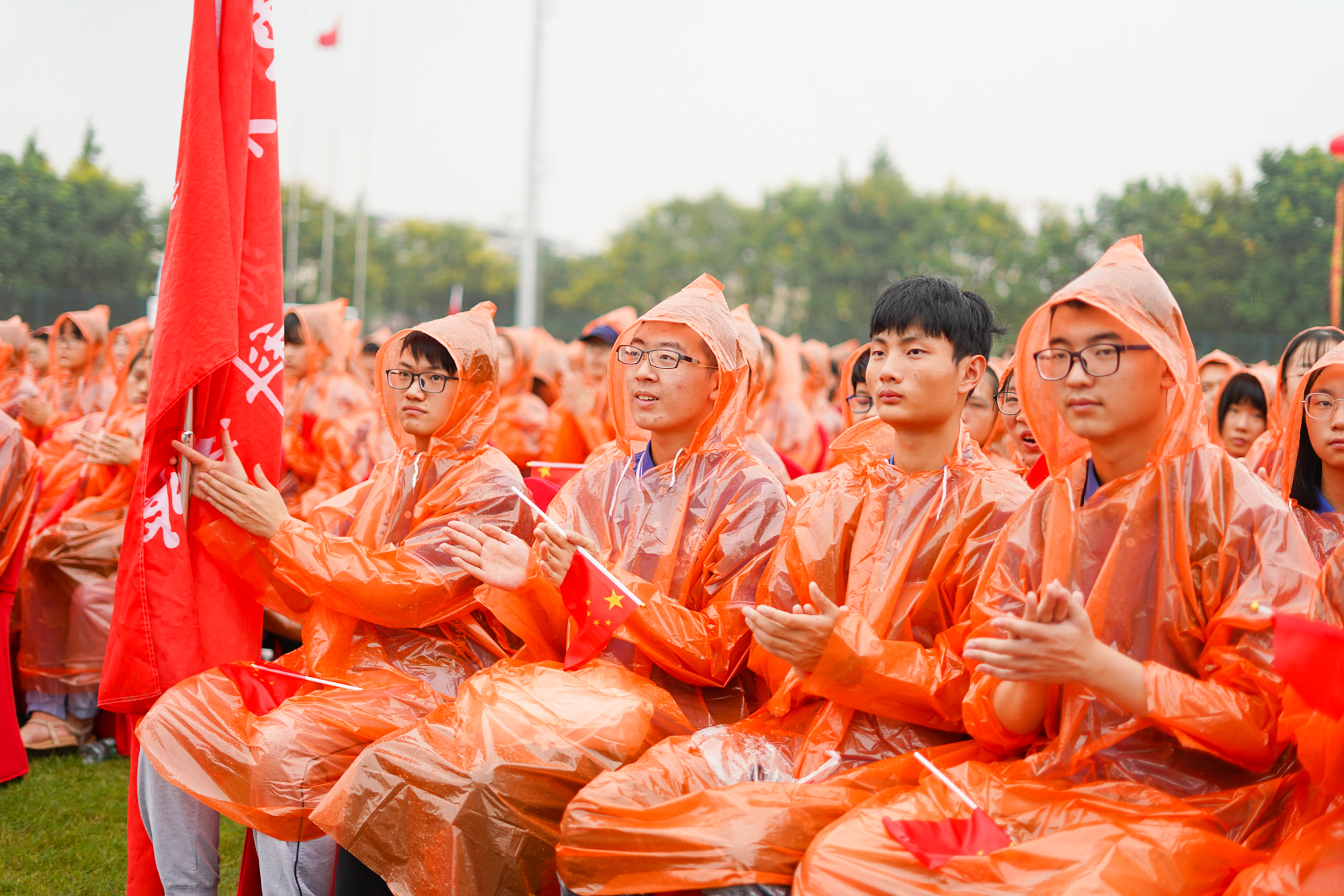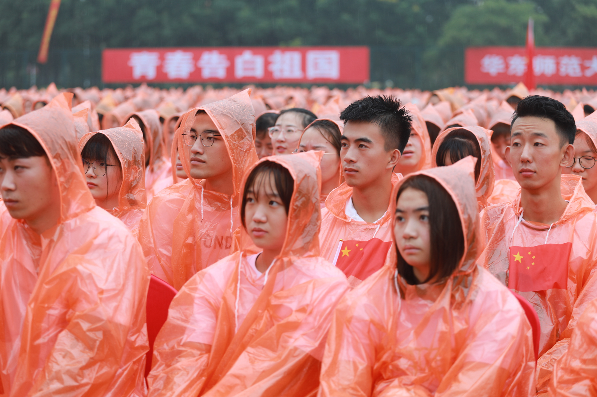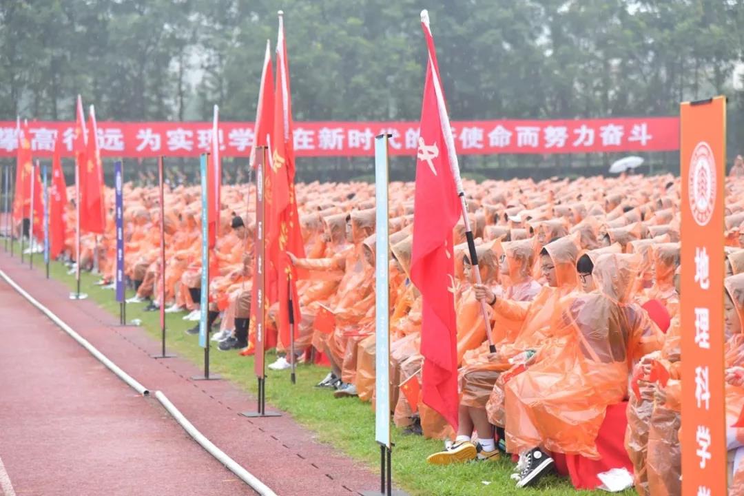 最后,两校区开学典礼分别在音乐学院教师吴睿睿、石春轩子的带领下,万名新生雨中唱响《我和我的祖国》,庆祝新中国成立70周年。