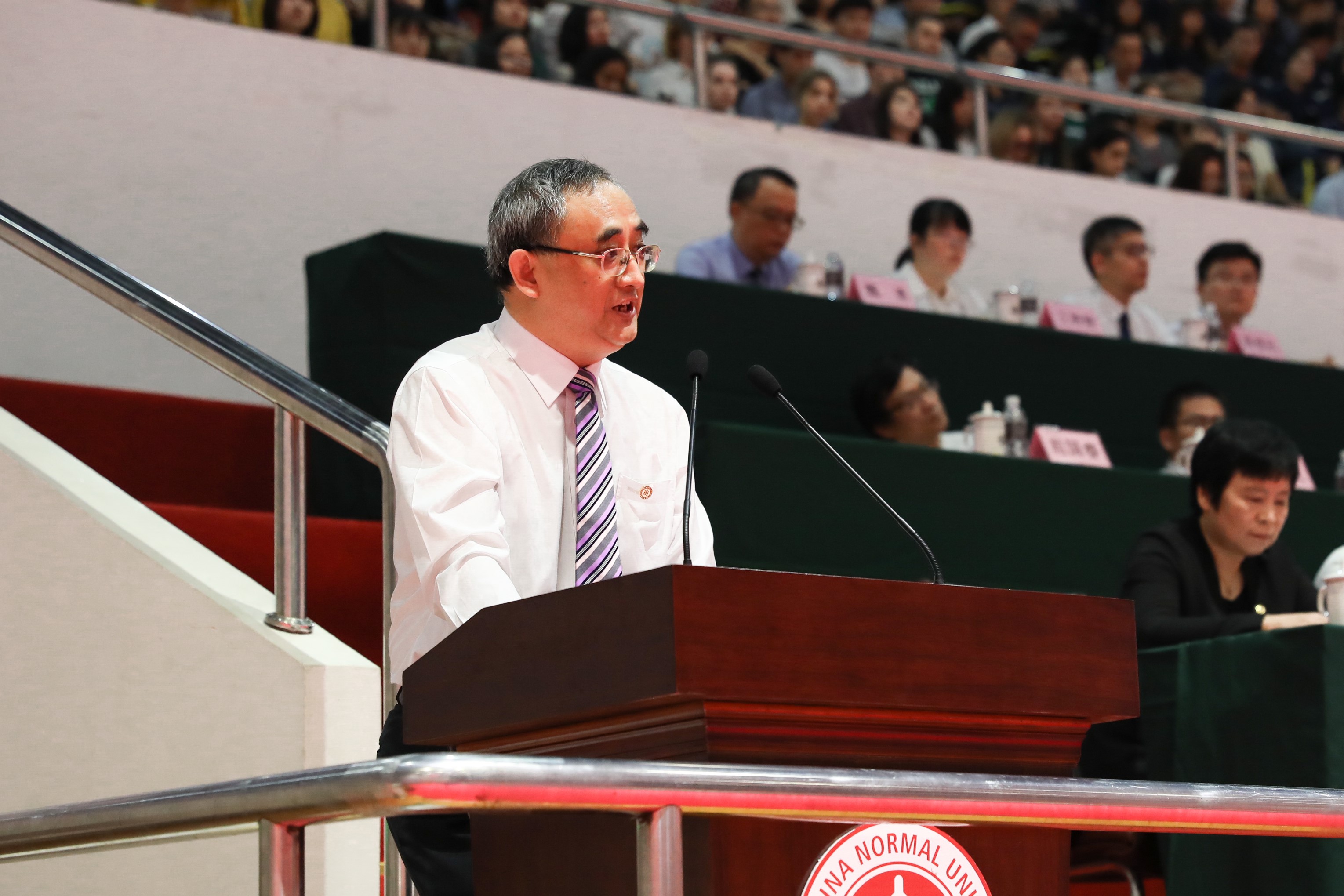 在开学典礼上,校领导为新生代表佩戴校徽。校徽是展示学校形象与文化的标识与名片。戴上校徽,不仅标志着新生们正式成为“师大人”,更意味着他们将担负起维护和树立学校形象的责任。