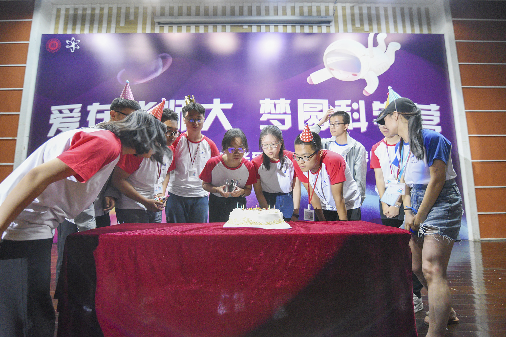 穿插在晚会中的颁奖环节,荣获优秀营员、stem挑战赛奖、最佳征文奖、优秀带队教师、优秀志愿者等奖项的获奖者纷纷上台领奖,合影留念。作为晚会的特别环节,华东师大为7月份生日的营员和带队老师过了一个特别的生日,他们头戴寿星帽,围在蛋糕前,在温暖的灯光和轻柔的歌声中,许下对未来的期许。
