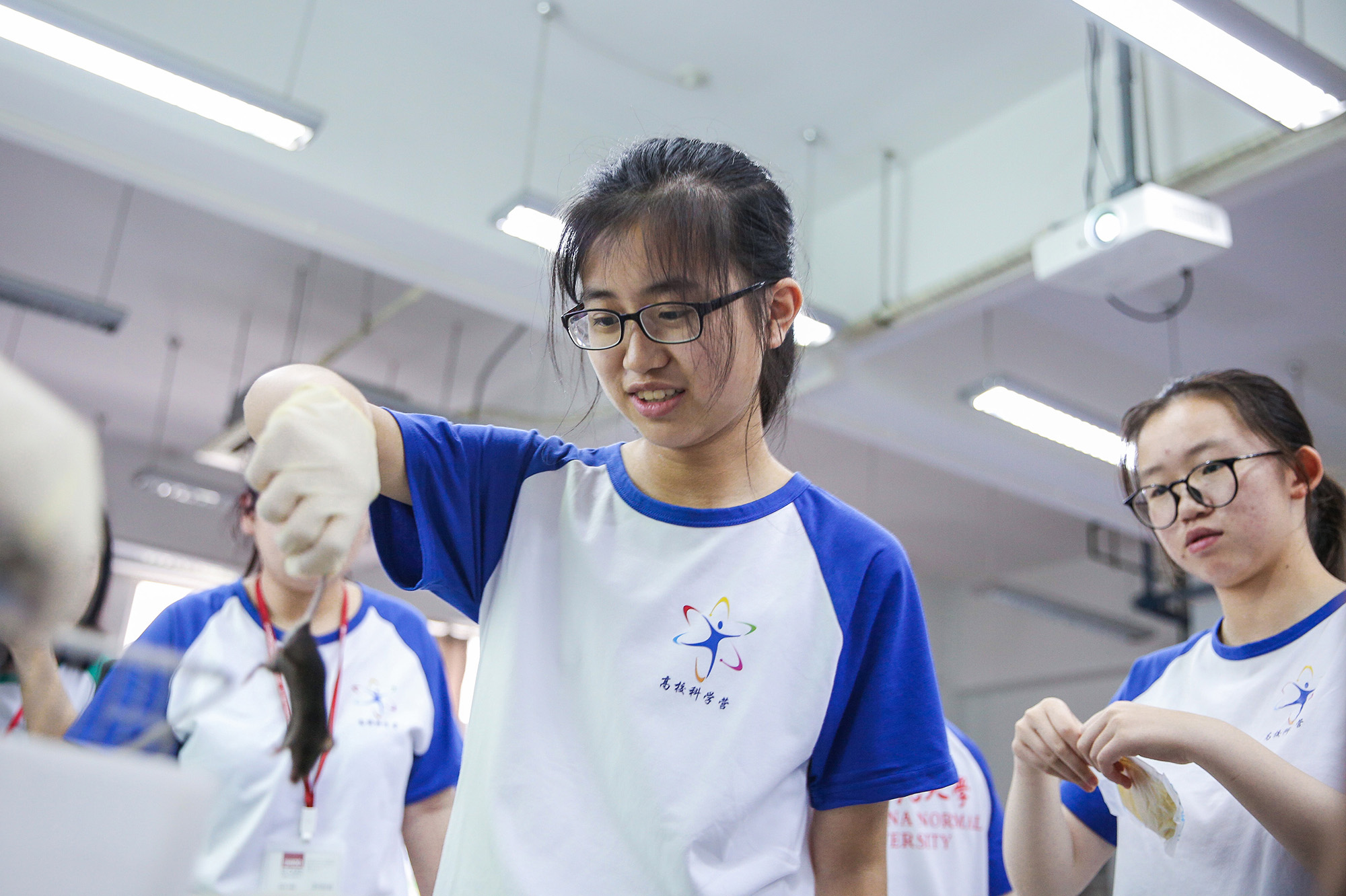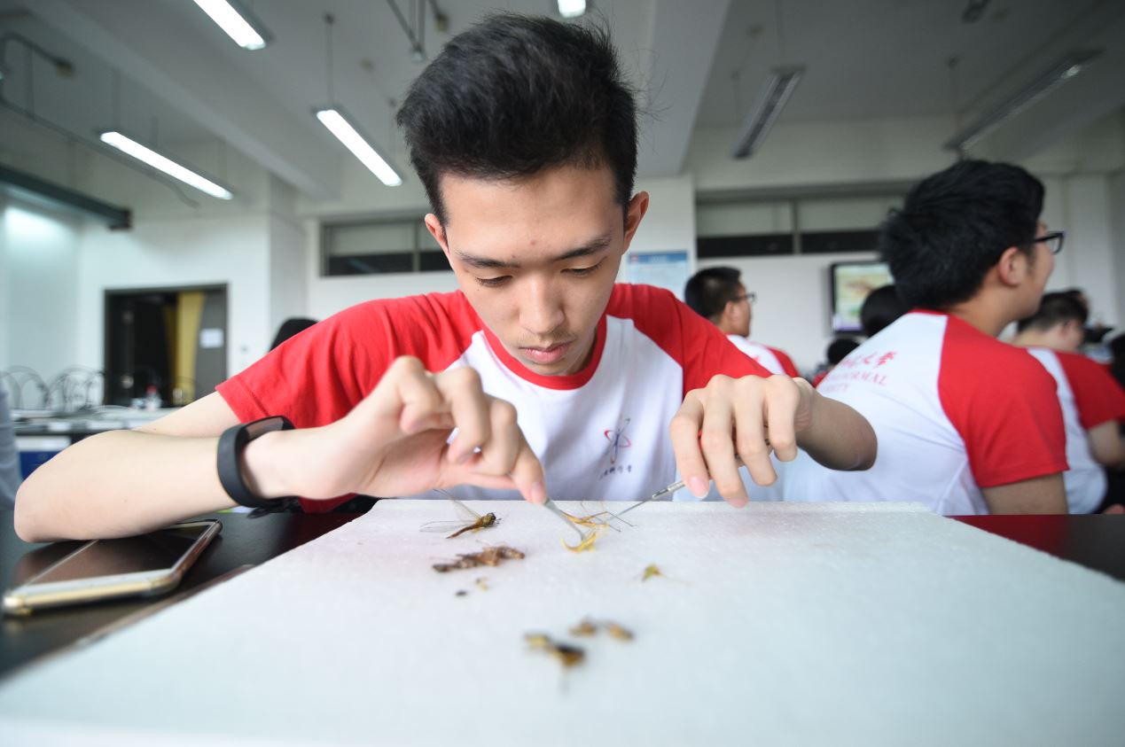 随后的实验环节,更是激发了营员们的兴趣。环境科学组对樱桃河进行取样分析,虽然刚下过雨,但河边的泥泞丝毫挡不住他们的脚步。营员们对采集到的水样进行水体指标总磷的测定,以及水质指标叶绿素a的测定。他们分工合作,在有限的时间内有条不紊地完成了实验。动物学组则是来到校园“逮昆虫”,天空飘着的小雨打湿了营员们的头发和衣襟,但是他们兴致高昂,每当成功捕获一只蝴蝶或蜘蛛,都会引起一阵欢呼。回到实验室,营员们对所捕昆虫进行认真观察后,在老师的指导下完成了昆虫标本的制作。动物生理学组则迎来了他们的新朋友——小白鼠。营员们把对小白鼠的好奇化成了做实验的劲头,在体验并亲身实践了小白鼠条件反射、心电图成图等常规操作后,营员们分别选取自己感兴趣的方向来设计实验方案,通过团队协作和实际操作来验证自己的设想。