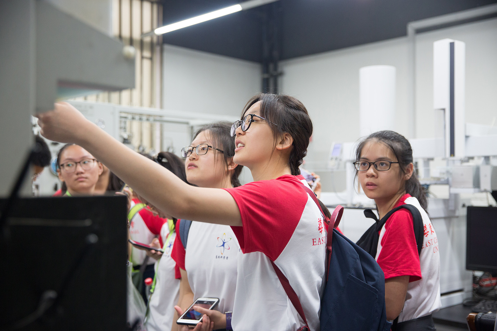 7月9日,营员们参观中山北路校区的重点实验室和校史馆,近距离感受了华东师大的科学精神与人文传统。上海数字化教育装备工程技术研究中心的AI教育机器人和阿尔法蛋、精密光谱科学与技术国家重点实验室的冷镱原子光钟和高功率飞秒光梳激光、上海市绿色化学与化工过程绿色化重点实验室的科研条件和实验仪器、脑功能基因组学教育部重点实验室的神经药理与毒理研究室、上海市高可信重点实验室的VR射箭游戏……这些前沿科技都让营员们大开眼界,大呼过瘾。校史馆内多媒体影像系统、感应电子书、校园电子地图等多种现代技术手段,全方位地展示了华东师大的历史沿革和发展成就。结合精彩的讲解,营员们仔细体悟华东师大的历史底蕴、文化传统和人文情怀,感受老一辈师大人的精神气质与斐然成就。