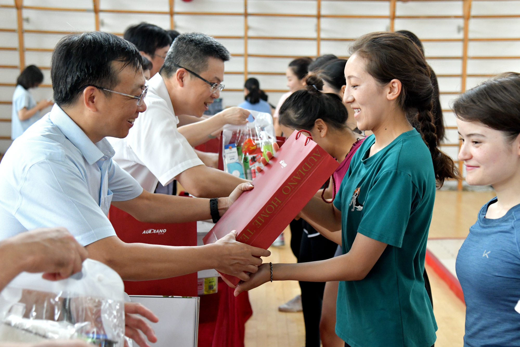第十一届全国民族运动会上海代表团秘书长、市民族宗教局副局长杜宇平,闵行区委常委、统战部部长李红珍,华东师大党委副书记曹友谊等向运动员们送上慰问品