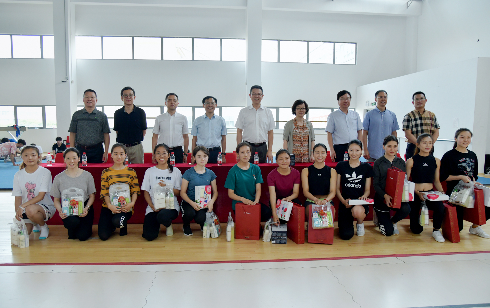 7月24日,第十一届全国民族运动会上海代表团秘书长、市民族宗教局副局长杜宇平,闵行区委常委、统战部部长李红珍,华东师大党委副书记曹友谊等来到闵行校区体育馆,看望慰问冒着酷暑备赛训练的民族健身操的运动员、教练员和工作人员。市民族和宗教事务局,闵行区委统战部、闵行区体育局,华东师大党委统战部、体育与健康学院等单位负责人陪同慰问。
