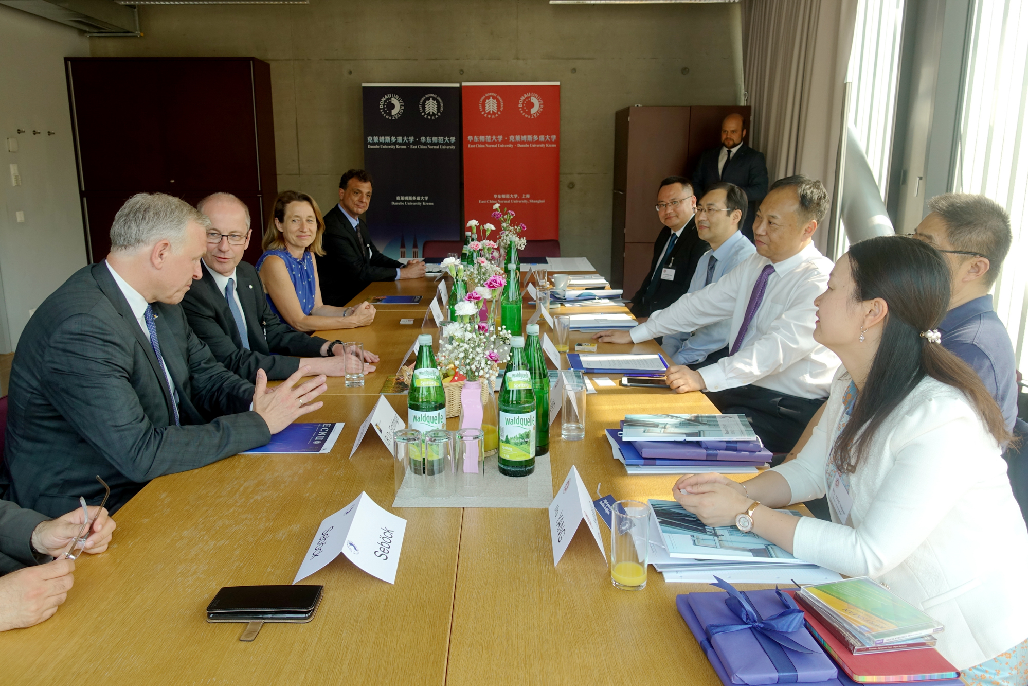 翌日,戴立益一行访问了克莱姆斯多瑙大学,受到该校校长Friedrich Faulhammer、科研副校长Viktoria Weber等的热情接待。戴立益感谢Friedrich Faulhammer的盛情相邀与热情款待,他回顾了两校此前开展的交流,强调教育是华东师大具有突出优势与长足发展的学科大类之一,这与德语区高校中唯一以终身教育为发展使命的克莱姆斯多瑙大学多有契合,且双方均秉持学科交叉融合的指导原则,在多个领域有着共同研究兴趣,两校合作交流的实质性发展着实大有可为。Friedrich Faulhammer对此热情回应,他表示继2019年4月访问我校后,非常荣幸能在多瑙河畔的克莱姆斯多瑙大学迎接代表团,以此回馈早前在丽娃河畔收获的盛情。他强调学校高度重视与华东师大的合作交流,希望本次访问能为加深双方全方面的了解与学科对接奠定坚实的基础。访问期间,代表团分别与克莱姆斯多瑙大学终身教育、应用音乐研究、工商管理、文化遗产与可持续发展等学科领域负责人友好会面,就双方在相应领域的研究进展与学术成果深入交流,并就联合学术研讨、短期访问项目等潜在具有可操作性的具体合作内容深入交换意见。
