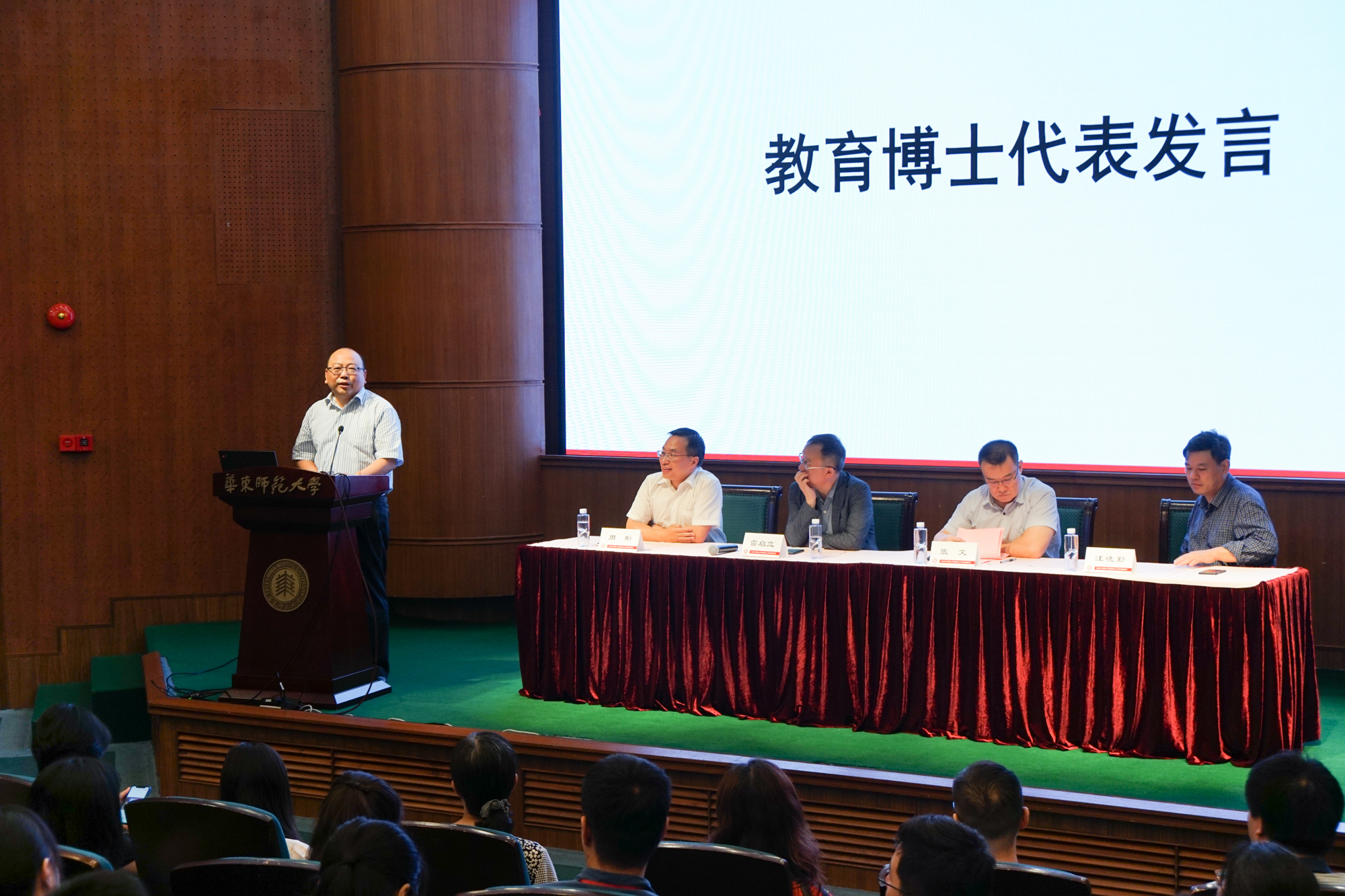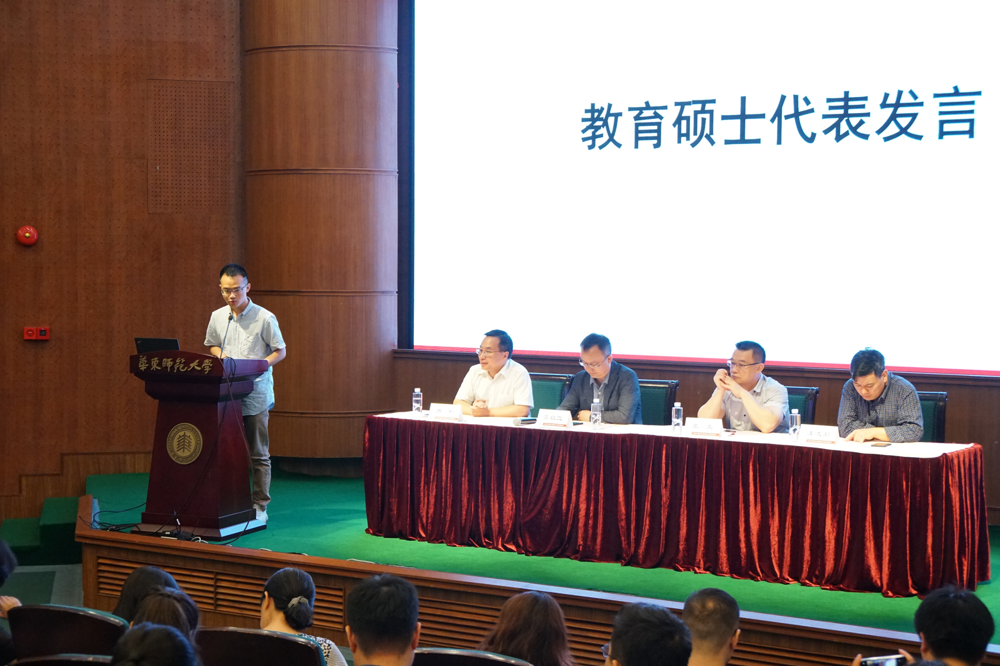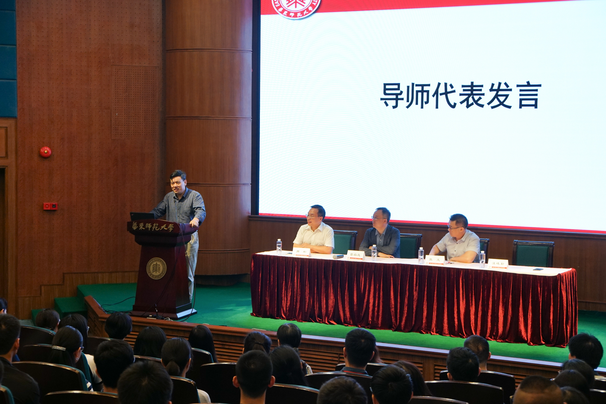 随后,教育博士代表郭金华和教育硕士代表钱志钢发言,都表达了进入华东师大学习的喜悦和期待。郭金华表示将在老师的教导和与同学的交流切磋中勇攀学术高山,不断增进教育智慧,希望能与同学们一同用所学的知识为中国教育现代化做出贡献。钱志钢也明确了未来的学习目标,表示将认真学习,在掌握丰富的专业知识的同时提高自己的教育研究技能和创新、协作、管理等能力。