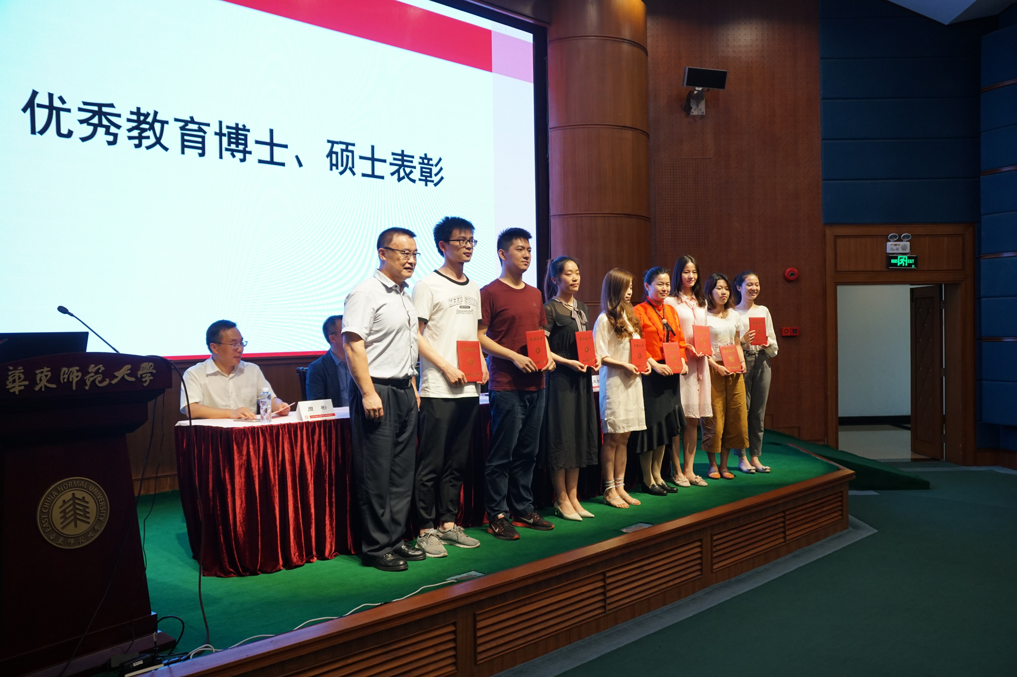 接着,大会表彰了2018-2019学年优秀教育博士、教育硕士,张文宣读了表彰决定,并与雷启立一同为获奖学员颁奖。获奖代表张琳发表获奖感言,从感化心灵、为人师表,着眼发展、努力奋进和迎接挑战、展望未来三个方面分享了自己在师大学习经历中的体会。