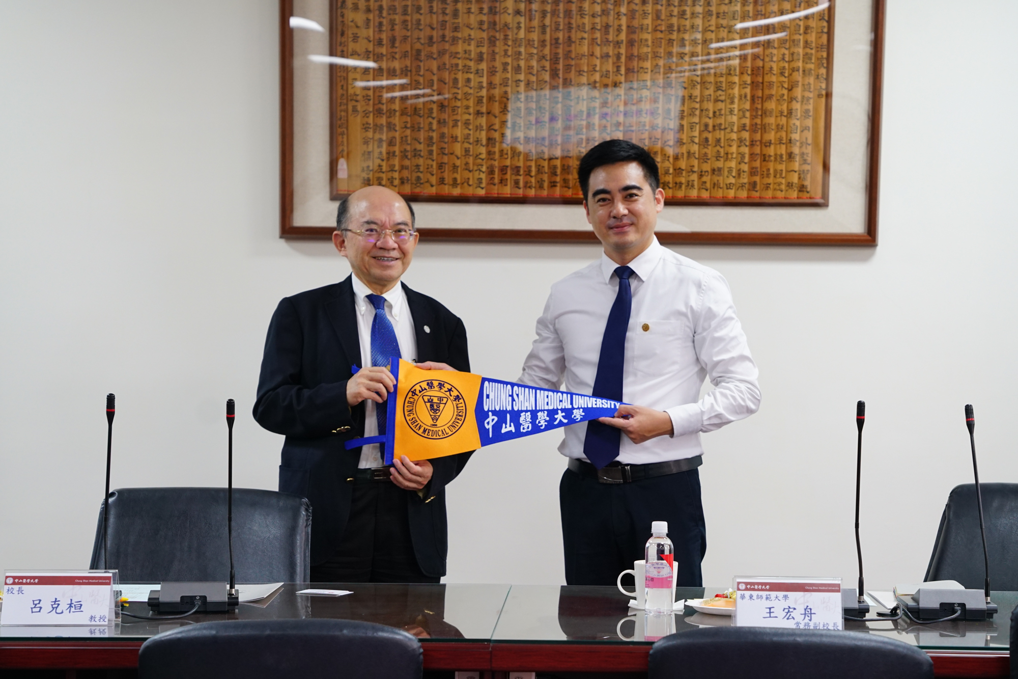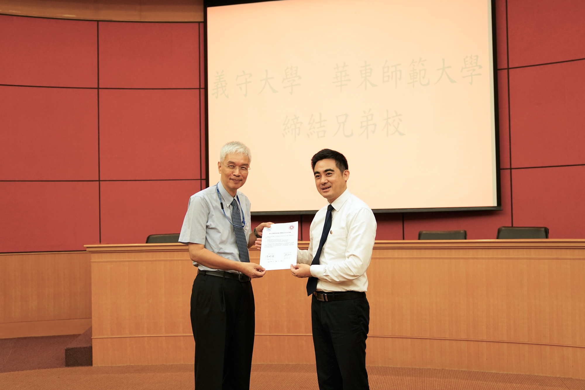 校党委常务副书记王宏舟与义守大学副校长周兆民交换两校合约书