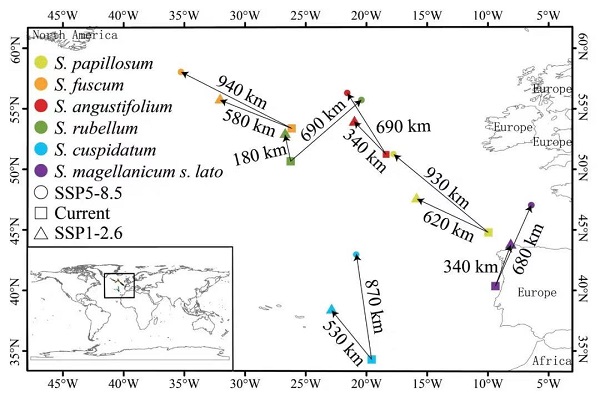 华东师大苔藓植物研究团队基于长期泥炭藓物种多样性的调查,首次模拟了不同气候情境下6种泥炭地优势泥炭藓物种的全球分布,发现随着全球变暖泥炭藓潜在分布区呈向北移动的趋势,且移动距离随着温室气体排放的加剧而增加。