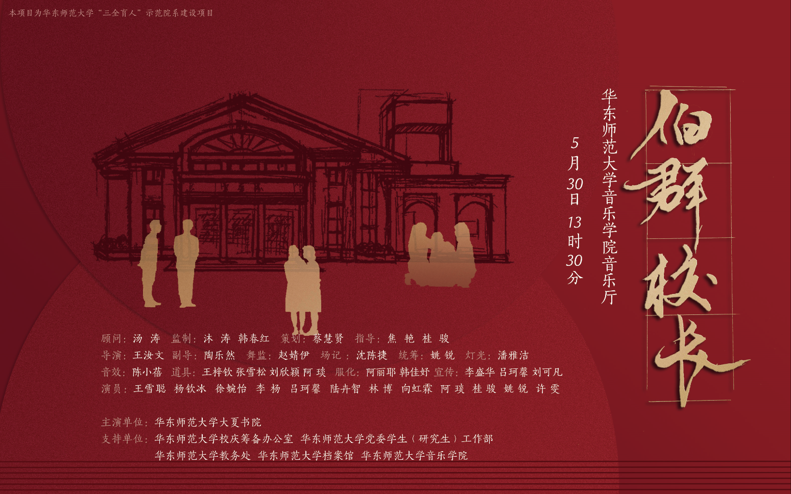 2021年,适逢建党百年华诞与3245澳门新莆京建校70周年。我校前身之一的大夏大学发扬“自强不息”的校训、“教师苦教,职员苦干,学生苦学”的“三苦精神”和“师生合作”的办学理念,使学校教学声誉卓隆,曾被誉为“东方哥伦比亚大学”。如今,以迎接建党百年为重要契机,大夏书院师生共同创作《伯群校长》,生动演绎了伯群校长在任期间的重要历史事件,时间跨度从1930年发展至1944年,较为全面地再现了王伯群校长对青年学生的保护、对坚持办学的执着、对大夏大学的情怀、对国家民族的责任,讲述师大故事、传递校史精神,献礼校庆70周年。欢迎各单位及个人前来观看。