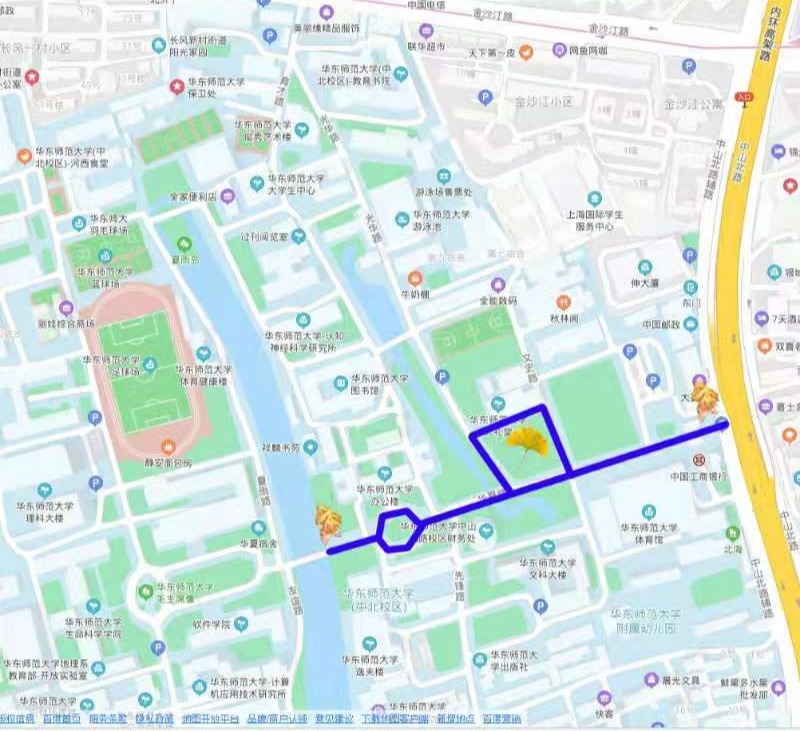 普陀校区华夏路(正门——大桥)、校园八大景之一“古木清晖”;闵行校区南门银杏林、杏林东路、杏林西路