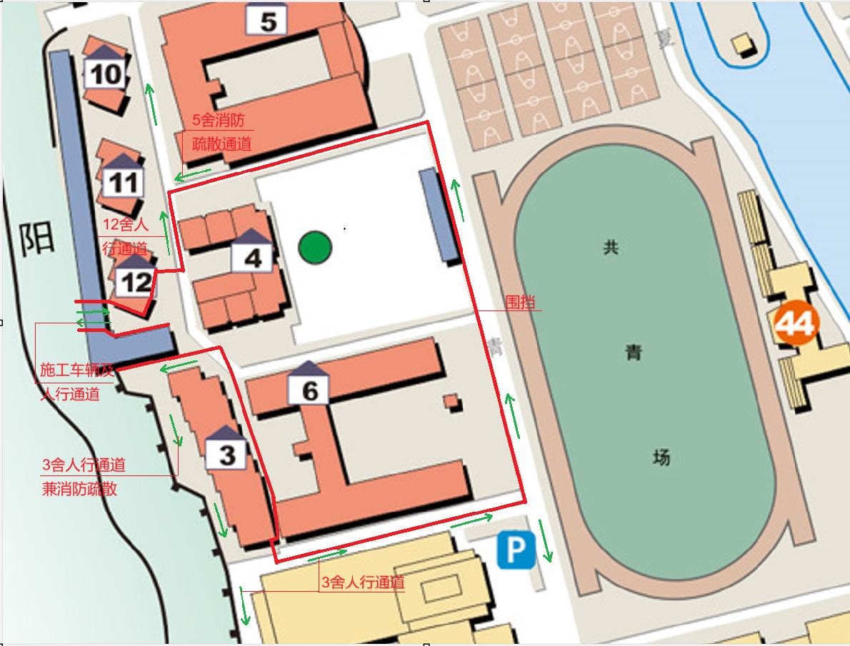 附图:第四、第六学生宿舍拆除施工区域及通行路线图(红线合围范围内为施工区域)