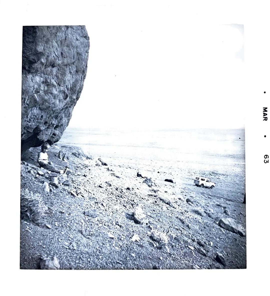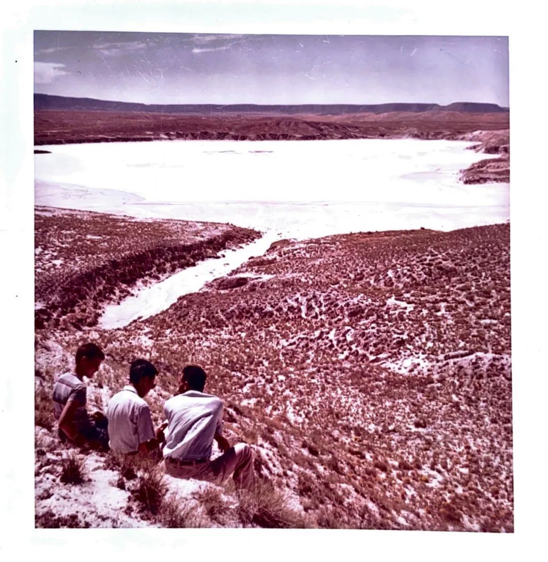 1963年2月,段义孚和哈里斯夫妇在美国新墨西哥州船石镇(Shiprock) 附近开展野外工作,哈里斯的大女儿莎拉坐在巨石旁边。段义孚的小卡车在照片的右侧,追不上哈里斯家的那辆轿车