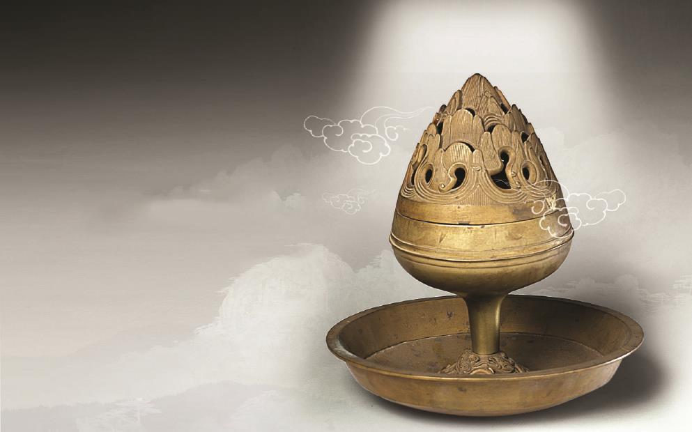 有着“香炉之祖”之誉的博山炉,即为两汉时期熏香文化的典型器形,是中华香文化里程碑式的见证。北宋吕大临《考古图》中记:“香炉像海中博山,下盘贮汤使润气蒸香,以像海之四环。”博山炉盖上常雕刻成峰峦状,峰与峰之间有许多镂刻小孔,其间雕有云气纹、人物及鸟兽。焚香时,香烟从孔中氤氲而出,令人仿似置身海中仙山。梁昭明太子萧统曾写下《铜博山香炉赋》赞曰:“禀至精之纯质,产灵岳之幽深。经般睡之妙旨,运公输之巧心。有薰带而岩隐,亦霓裳而升仙。写嵩山之巃嵸,象邓林之芊眠。方夏鼎之瑰异,类山经之俶诡。”