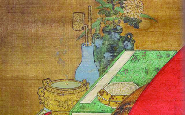 清三代行香渗透至日常生活方方面面。线香的出现使得用香更为便捷,炉、瓶、盒三件一组的书斋案供成为文房清玩的典型陈设。图为古画中炉、瓶、盒三件一组的书斋案供