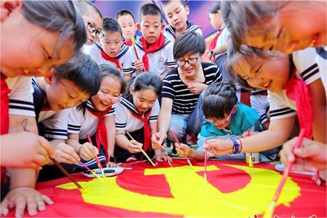 河北省秦皇岛市海港区昌德城社区党员和建国路小学学生共同绘制党徽。曹建雄摄/光明图片