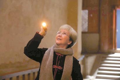 影片开始时,耄耋之年的主人公缓缓步入熟悉的洞窟。画面是大逆光,茅善玉从光影中走来,洞窟外的阳光映衬着她瘦弱的身影,如同万丈佛光衬托的禅定佛像。在这片光影中,茅善玉气定神闲地开唱,回忆坚守莫高窟一路走来的风雨艰辛。大道至简,此刻演员没有过多的调度、台词和表情,眼神和气质却最与樊锦诗相似,不是因为化装造型,而是茅善玉表达出的淡定、从容和宁静的神韵。
