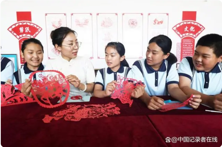 河北省唐山市丰润区火石营镇黄昏峪小学的教师指导孩子们学习剪纸传统技艺。