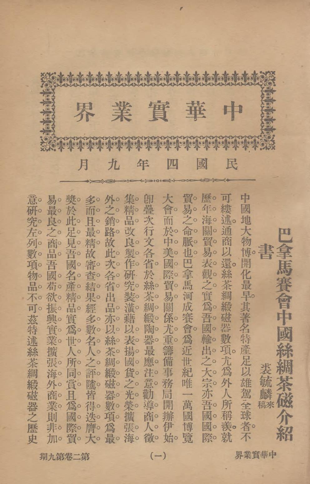 裘毓麐,“巴拿马赛会中国丝绸茶磁介绍书”,载《中华实业界》1915年第2卷第9期