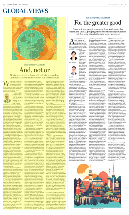 最重要的是,马克思主义在中国的发展是中国现代化和民族复兴的有机组成部分,是中国根据过去历史经验总结出来的人类价值观的合乎逻辑的表达。中国本身就是一部拥有5000多年文明史的大集合;近现代以来,中国既没有像西方国家一样走上剥削他人的殖民道路,也没有屈服于西方,向列强低头,而是独立自主地取得了前所未有的增长和发展。也就是说,中国化的马克思主义并不寻求与西方文明发生冲突;恰恰相反,它强调的是中国哲学的第一原则——“和”,而不是“或”。换句话说,是强调“兼容并包”,而不是“非此即彼”。这个“和”字,早在几千年前的商朝就出现在了甲骨文上;如今,它已成为一个成熟大国在全球事务和人类发展进程中促进更大的和谐与民主的原则。