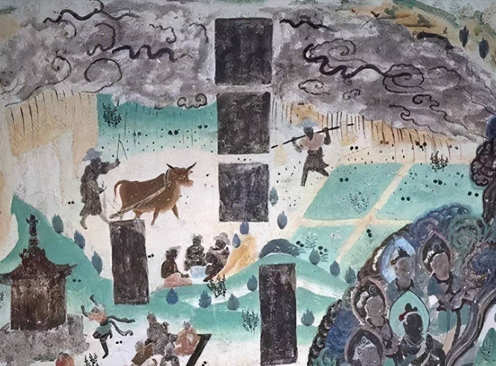 春雨对作物的生长意义重大,要让庄稼切实享受到春雨的滋润,最好在雨水前后完成播种植栽。莫高窟第23窟就有一幅雨中耕作图,图中乌云密布,雨水倾泻,一位农夫挥鞭赶牛,在雨中耕种,另一位挑担行走,身旁畦田青青