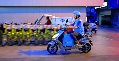 “外卖诗人”王计兵奔驰在送外卖路上。资料图片