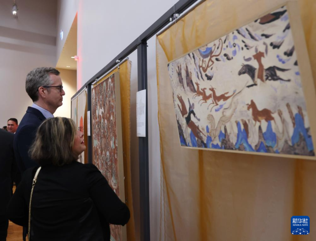 在新西兰首都惠灵顿举行的中国驻新西兰大使馆国庆招待会上,嘉宾们驻足观看敦煌文化展。新华社发
