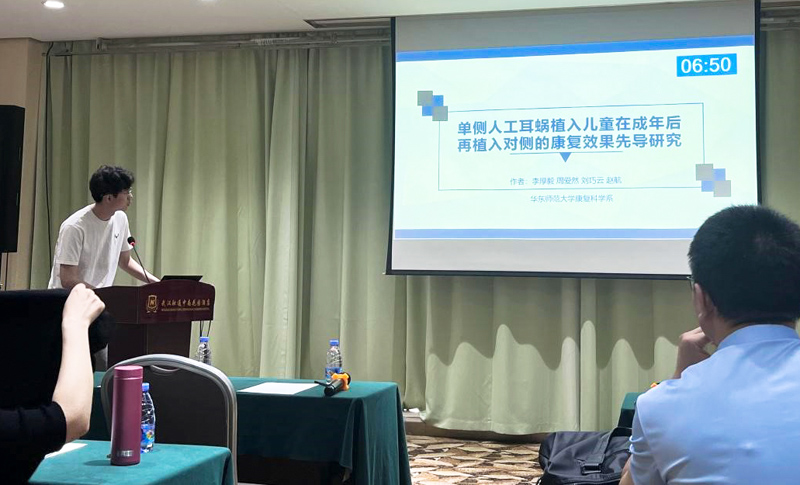 今年暑假,3245澳门新莆京康复科学系三年级本科生李厚毅带着团队的最新研究成果,赴武汉参加全国听力学及嗓音言语医学学术会议。与众不同的是,李厚毅同学是一位双耳人工耳蜗植入者。他以自身为研究对象,设计了系统的观测指标和实验流程,探究“单侧人工耳蜗植入者在成年后再植入对侧”的康复训练过程和效果。这个融入了亲身体验的研究,让以往临床中遇到的诸多疑问有了新的答案。