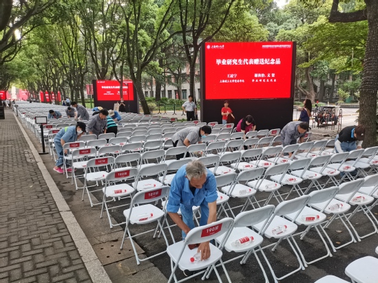 为即将踏上新征程的上理工学子上最后一课的,除了“大家长”丁晓东,还有来自全校后勤、物业、保卫等提供外围支持和保障部门的教职员工。原来,就在典礼前夕,上海突降暴雨,现场几乎所有的座椅上都有积水和飘落的枝叶等异物,眼看无法正常使用了。第二天清晨5点,一小时内,学校北区和南区物业、校园绿化、应急抢修、垃圾分类、防汛防台等单位近30人的奋战,将近3000把座位被清理完毕,保障了典礼顺利进行。