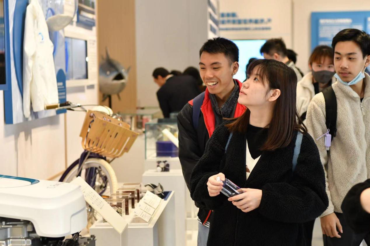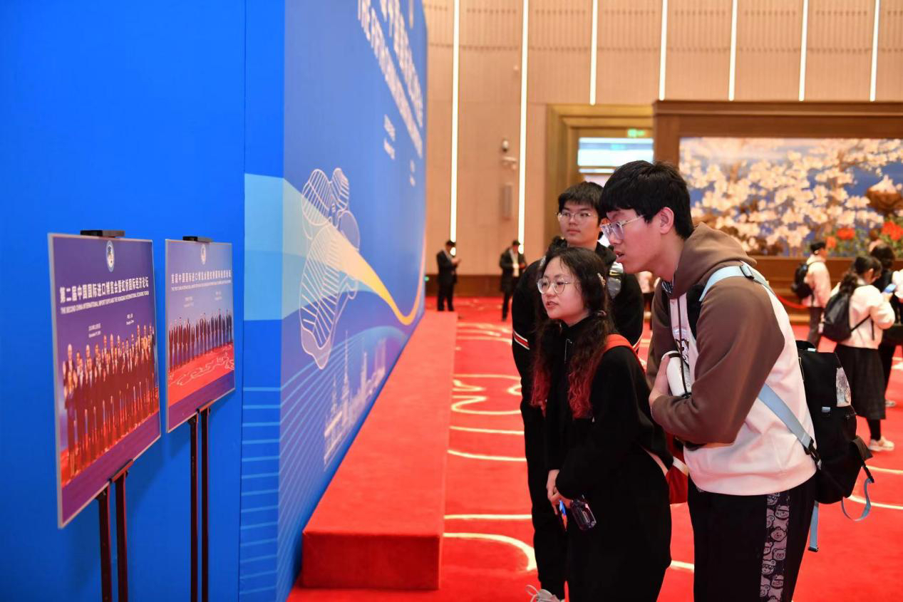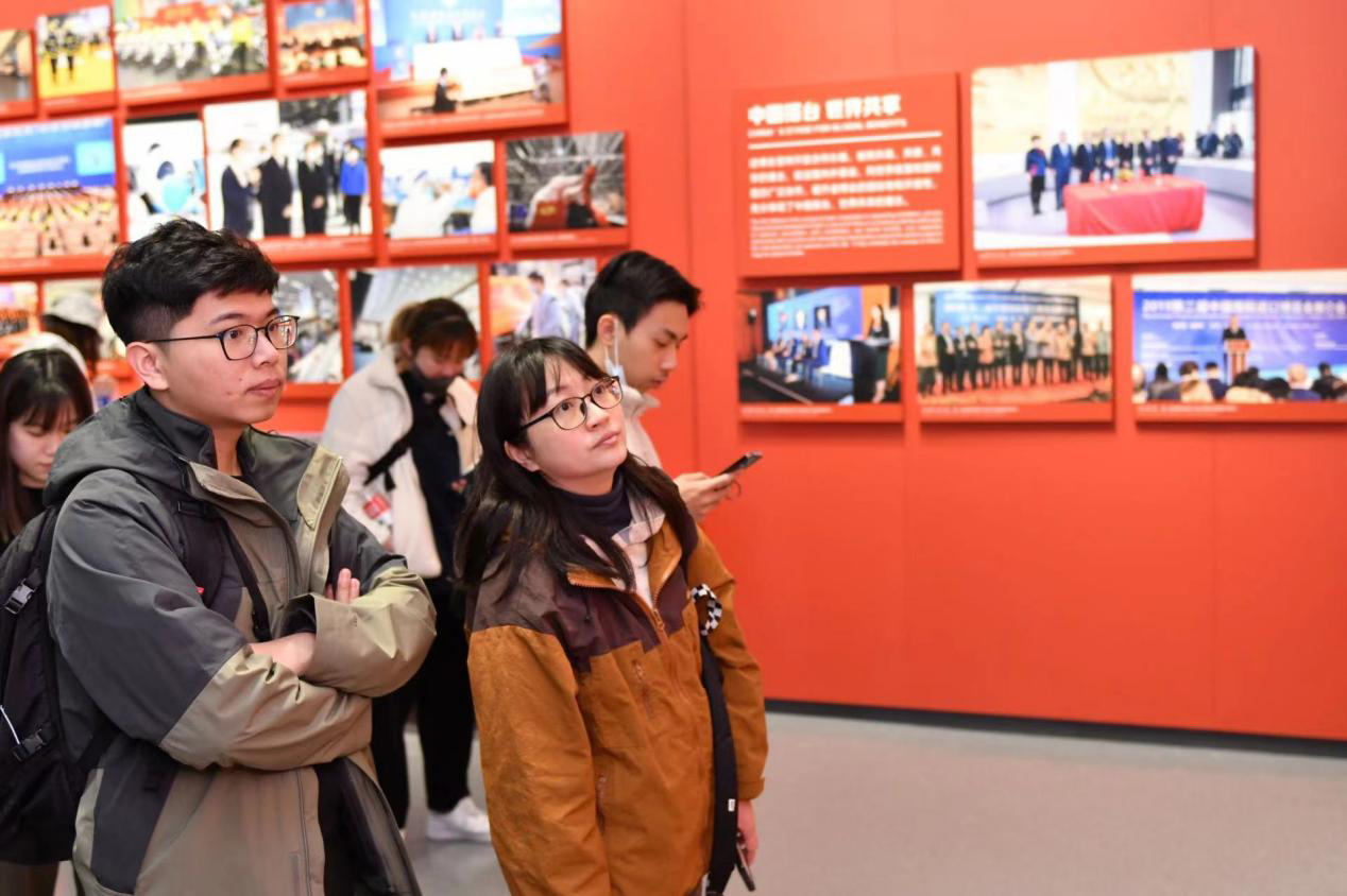 在中建八局新型建造工程公司党委副书记董继勇、工会副主席高晓飞的带领下,四地高校学子参访国家会展中心,聆听了国家会展中心建设者与进博会的故事。在实地参访过程中,学生们感受到了国家会展中心的建造之难与结构之巧,深度体悟中建八局建设者们的铁军精神与匠心建造。在参访进博会文化馆过程中,通过260余张图片、150余件实物展品、5组实景沙盘,以及大型多媒体互动展项,学生们全方位了解了进博会的功能定位、筹办过程、亮点特色、成效意义以及产生的深远影响,并感慨于中国发展的开放姿态与突出成就。