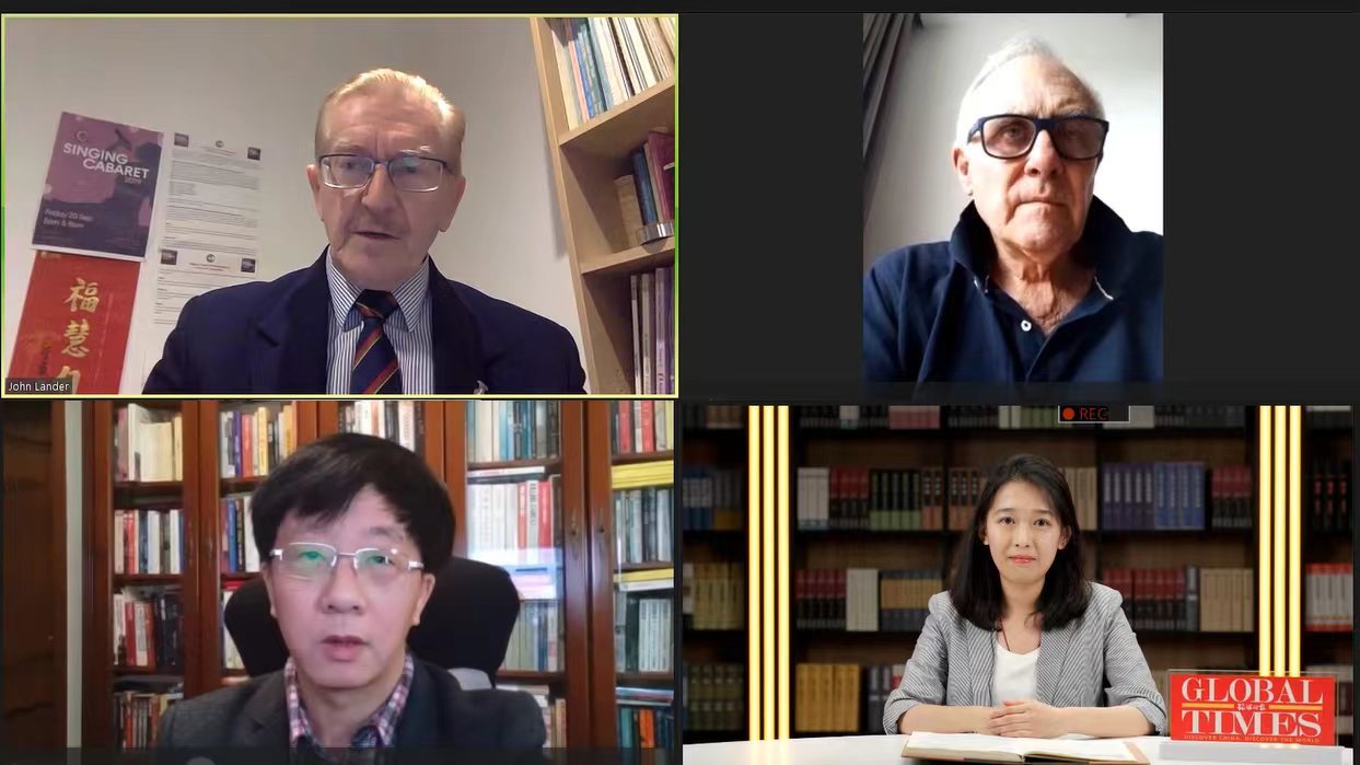 “中澳关系”话题圆桌论坛截图:约翰·兰德(左上)、布鲁斯·黑格(右上)、陈弘(左下)和《环球时报》记者李艾鑫(右下)。