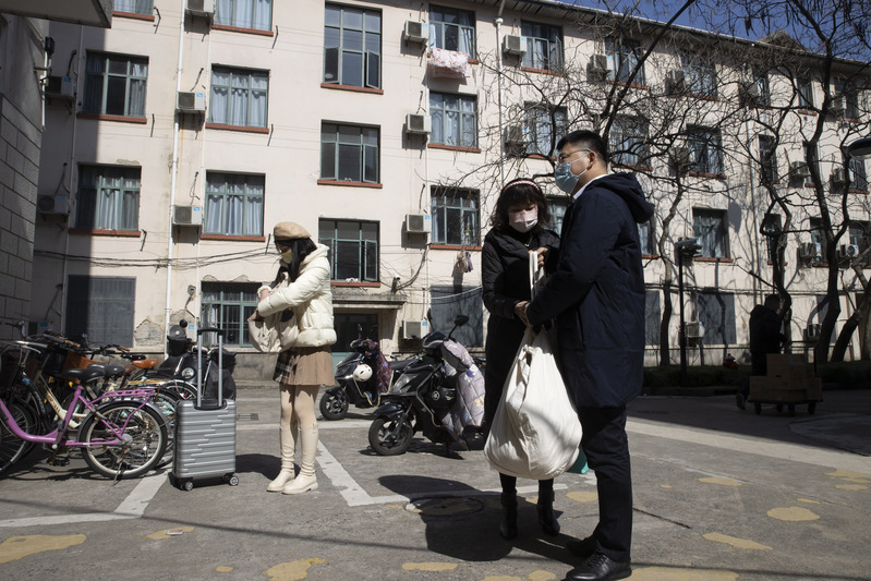 爱人和女儿进入女生寝室收拾行李,王先生在宿舍楼下等候。