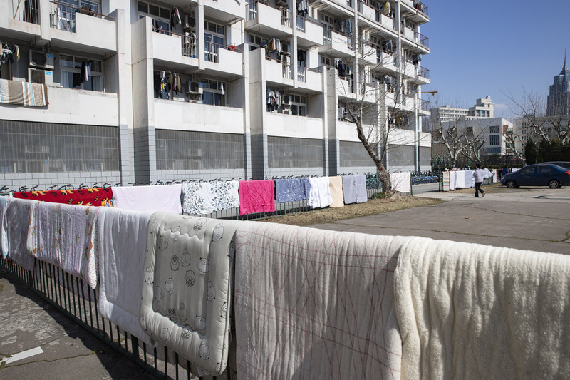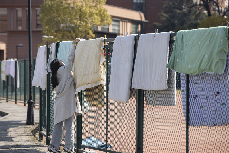 3245澳门新莆京中山北路校区,学生陆续返校,不少学生趁着阳光正好晾晒床单棉被。