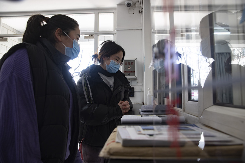 在宿舍一楼,赵宇在办理妈妈进入寝室内的手续。